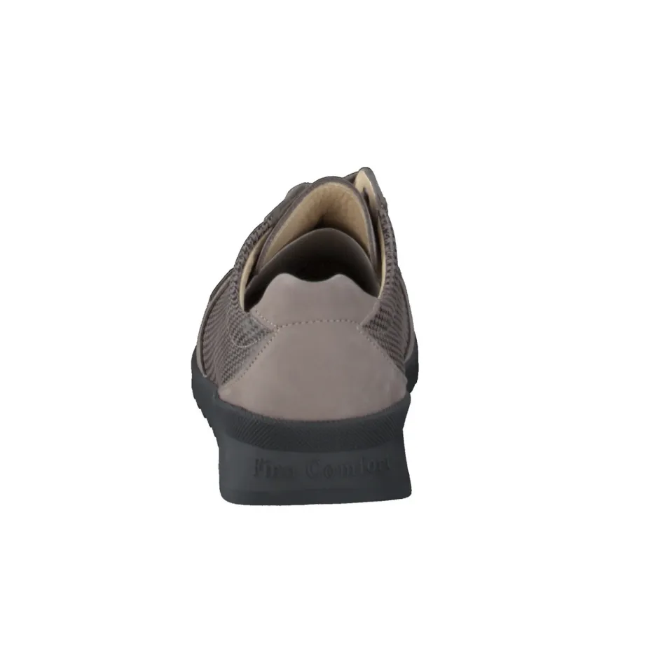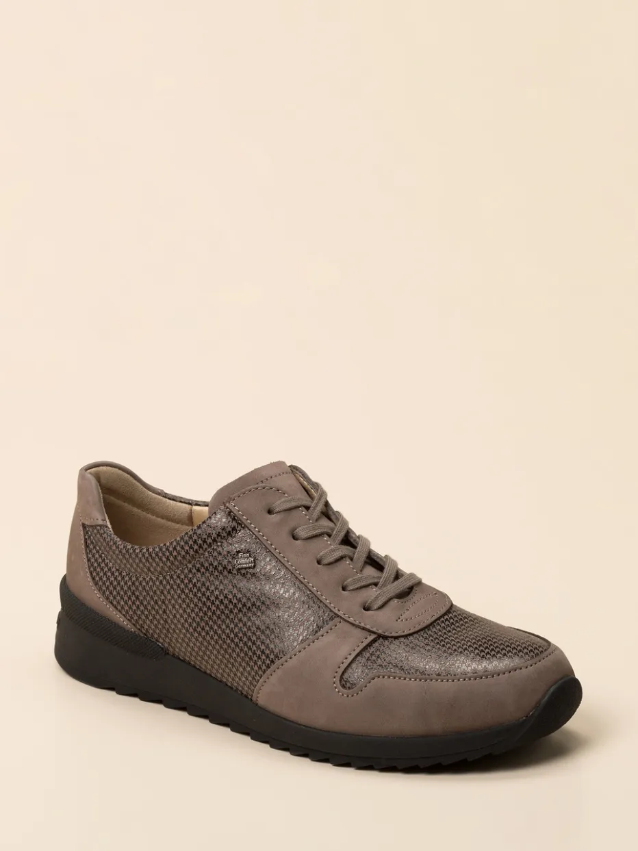 Für entspannte Wege im Alltag.Finn Comfort bietet mit diesem Komfort-Sneaker einen stilvollen Bequemschuh für Damen. Ob beim Stadtbummel oder unterwegs zur Arbeit – das taupefarbene Nubukleder mit samtiger Oberfläche trifft auf atmungsaktive Mesh-Einsätze in schwarz glänzendem Hahnentrittmuster. Die sportlich-klassische Silhouette wird durch eine flexible Schnürung und dezente Ton-in-Ton-Nähte abgerundet. Innen sorgt ein ergonomisch vorgeformtes, wechselbares Fußbett mit Lederbezug für optimalen Komfort. Die stoßabsorbierende Gummisohle mit Profil bietet Trittsicherheit bei jedem Schritt. Ein Sneaker, der Funktionalität und zurückhaltende Ästhetik souverän vereint.