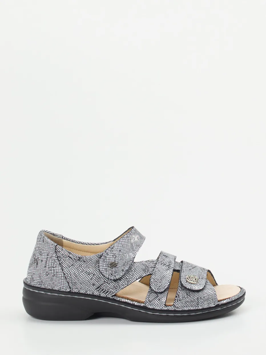 Stilvoll entspannen mit Komfortgarantie.Finn Comfort präsentiert mit dieser Komfortsandale ein Modell, das Funktionalität und Design harmonisch vereint. Ob zu Hause beim Entspannen oder beim Spaziergang durch die Stadt – das geprägte Leder mit genarbter Schlangenstruktur in edlem Silbergrau sorgt für ein modisches Statement. Das auf Komfort ausgelegte Modell besitzt drei individuell verstellbare Klettverschlüsse, ein herausnehmbares, lederbezogenes Korkfußbett sowie eine flexible PU-Sohle mit rutschhemmender Wirkung. Dezente Metallic-Akzente und eine leicht glänzende Oberfläche unterstreichen den zeitgemäßen Look. Komfort trifft auf fein abgestimmte Detailqualität typisch Finn Comfort.
