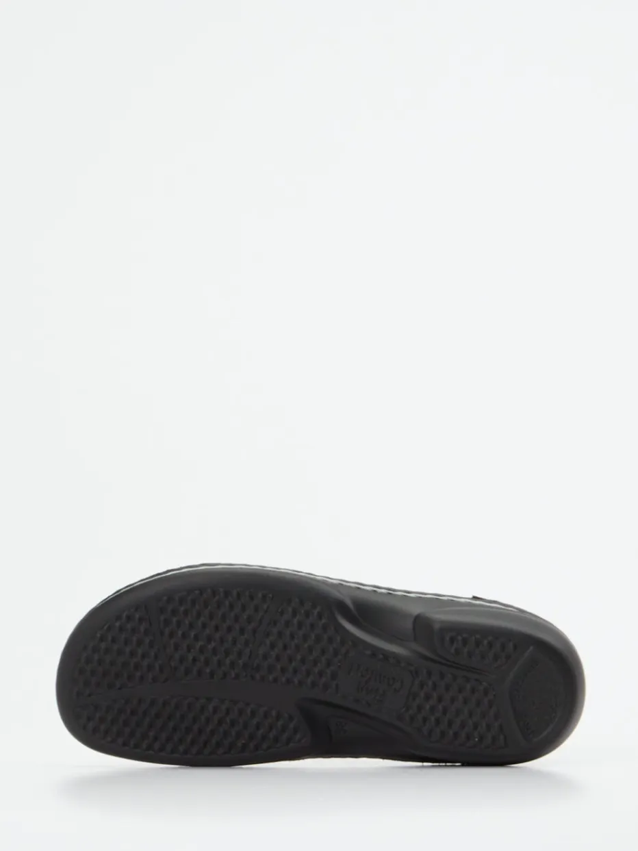 Komfort neu definiert.Die Marke Finn Comfort steht bei dieser Komfortsandale für funktionale Eleganz im Alltag. Für Erledigungen, entspannte Spaziergänge oder zu Hause bietet das Modell Biella höchsten Komfort. Das schwarze Kalbleder mit matter Oberfläche wird durch weiße Kontrastnähte und eine silberfarbene Zierschnalle akzentuiert. Drei individuell einstellbare Klettverschlüsse sorgen für optimale Weitenanpassung, während ein herausnehmbares, lederbezogenes Korkfußbett ergonomische Unterstützung bietet. Der geschlossene Fersenbereich und die flexible, rutschhemmende PU-Sohle ergänzen das funktionale Design. Ein harmonischer Begleiter für komfortorientierte Looks an warmen Tagen – typisch Finn Comfort.