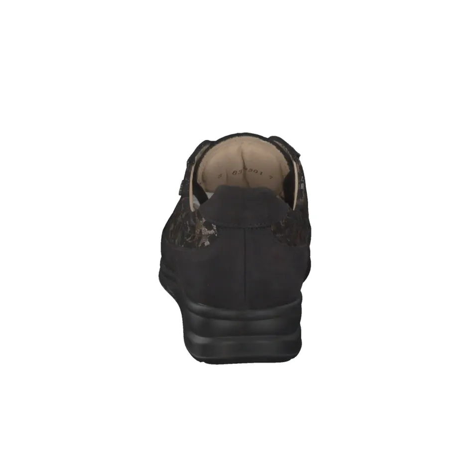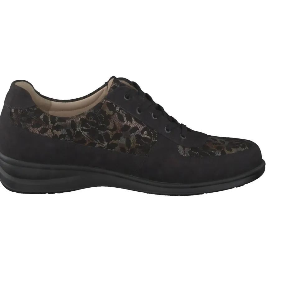 Ob für entspannte Alltagspfade oder einen gemütlichen Stadtbummel: Das schwarze Veloursleder in samtig-matter Optik trifft auf Mesh mit floraler Spitze und sorgt für ein angenehmes Fußklima. Die klassische, rund geformte Silhouette mit toniger Schnürung und dezenten Glanzakzenten verleiht dem Modell zurückhaltende Eleganz. Der gepolsterte Schaftrand erhöht den Tragekomfort, das lederbezogene Korkfußbett ist herausnehmbar und mit Einlagen kompatibel. Die rutschhemmende Gummisohle dämpft jeden Schritt. Floral Mesh und Transparenz-Effekte greifen aktuelle Trends subtil auf.