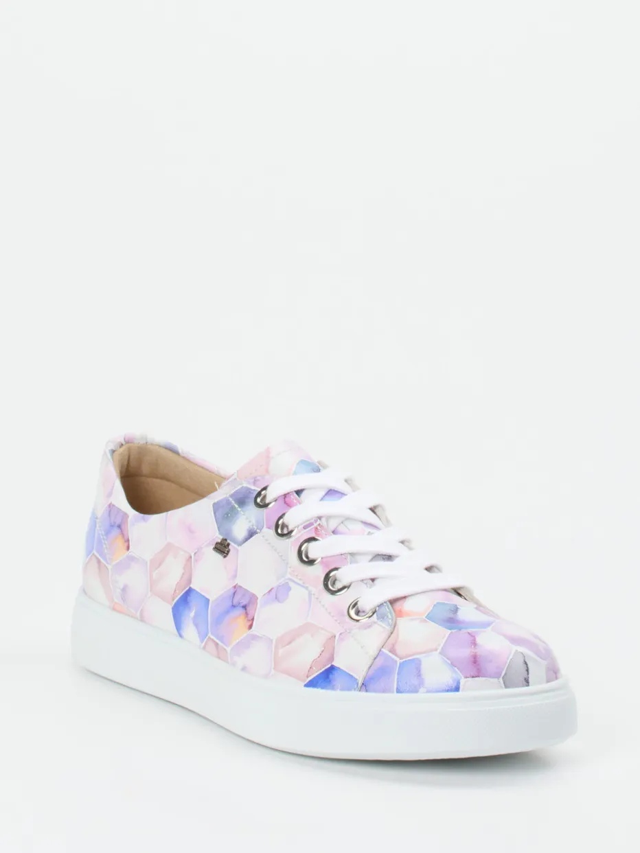 Geprägtes Leder mit pastelligem Aquarellmuster trifft auf ergonomische Funktionalität – ein Sneaker, der Design-Statement und Komfort gekonnt verbindet.