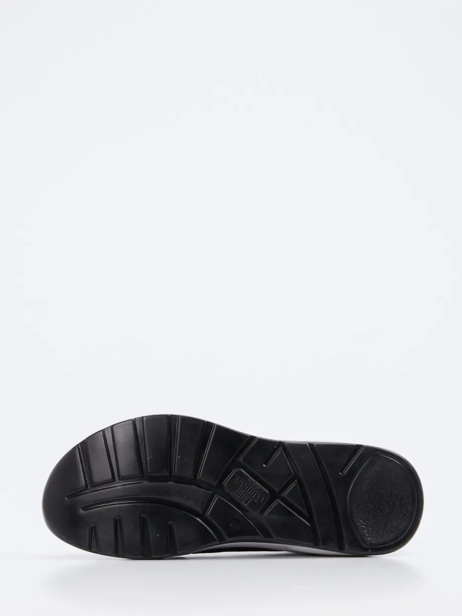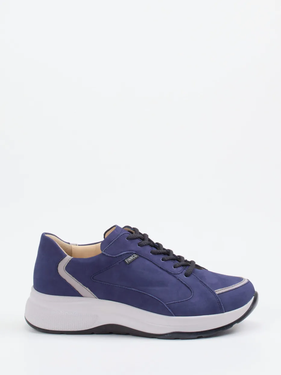 Für stilvolle Leichtigkeit im Alltag.Finn Comfort präsentiert mit diesem Sneaker ein komfortbetontes Modell für entspannte Alltagsmomente. Das tintenblaue Nubukleder begeistert durch seine feine, samtig matte Oberfläche und wird durch hellgraue Overlays dezent akzentuiert. Die sportlich-gerundete Silhouette unterstreicht den Casual-Charakter, während Details wie Ziernähte, gepolsterter Einstieg und eine dynamisch strukturierte Gummisohle den funktionalen Anspruch unterstreichen. Innen sorgt ein lederbezogenes Kork-Fußbett für ergonomischen Komfort und kann bei Bedarf gegen eigene Einlagen getauscht werden. Stilistisch passt dieses Modell ideal zu minimalistischen Relax- oder Streetwear-Looks. Komfort trifft Alltagstauglichkeit – typisch Finn Comfort.
