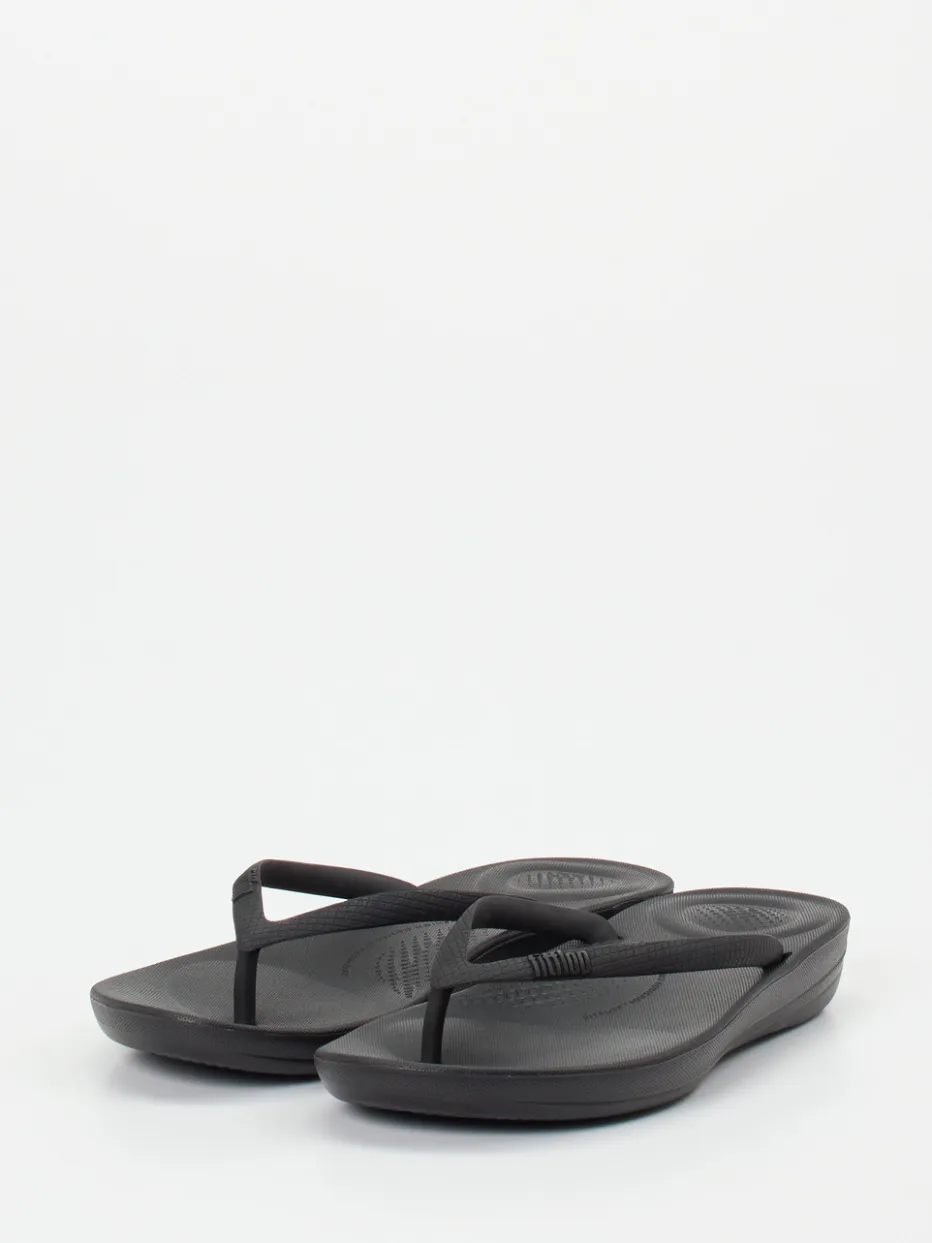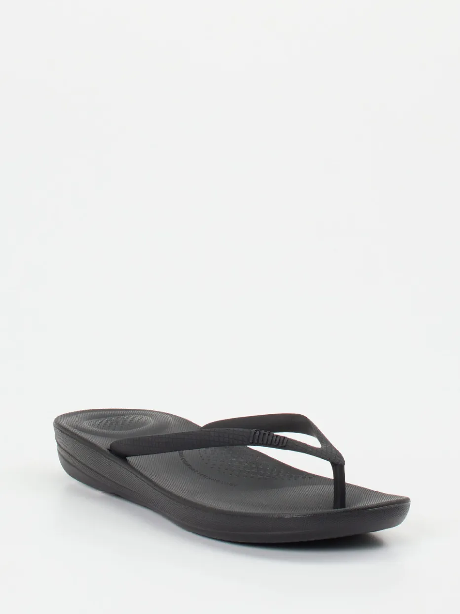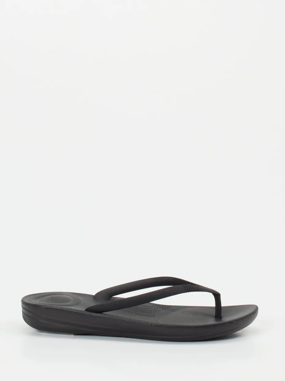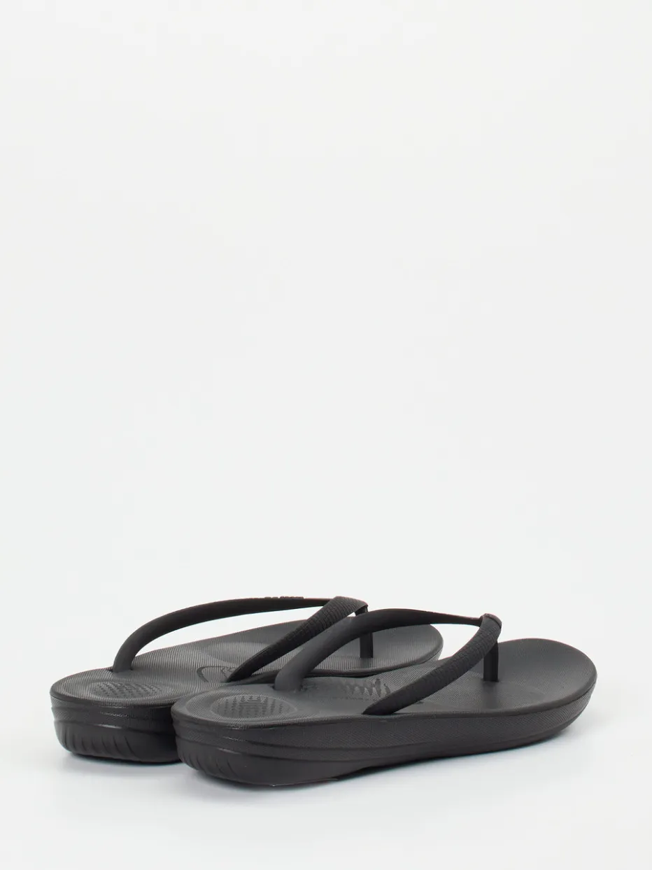 Sommer-Leichtigkeit für jeden Tag.FitFlop präsentiert eine klassische Zehentrenner-Sandale für Damen, gefertigt aus formstabilem, wasserabweisendem EVA-Kunststoff. Ob beim Strandspaziergang oder entspannt zu Hause getragen – die schwarze Badepantolette überzeugt durch ihr mattes Finish, ein anatomisch geformtes, strukturiertes Fußbett und ihre rutschhemmende Kreppsohle. Besonders markant zeigt sie sich mit geprägtem Markenlogo auf Riemen und Fußbett. Der ergonomische Aufbau sorgt für stabilen Halt und angenehme Dämpfung. Minimalistisch geprägt lässt sich der Look vielseitig kombinieren – etwa zu Shorts oder entspannten Sommerkleidern. FitFlop vereint Komfort, Funktion und schnörkellosen Stil auf leichte Art.