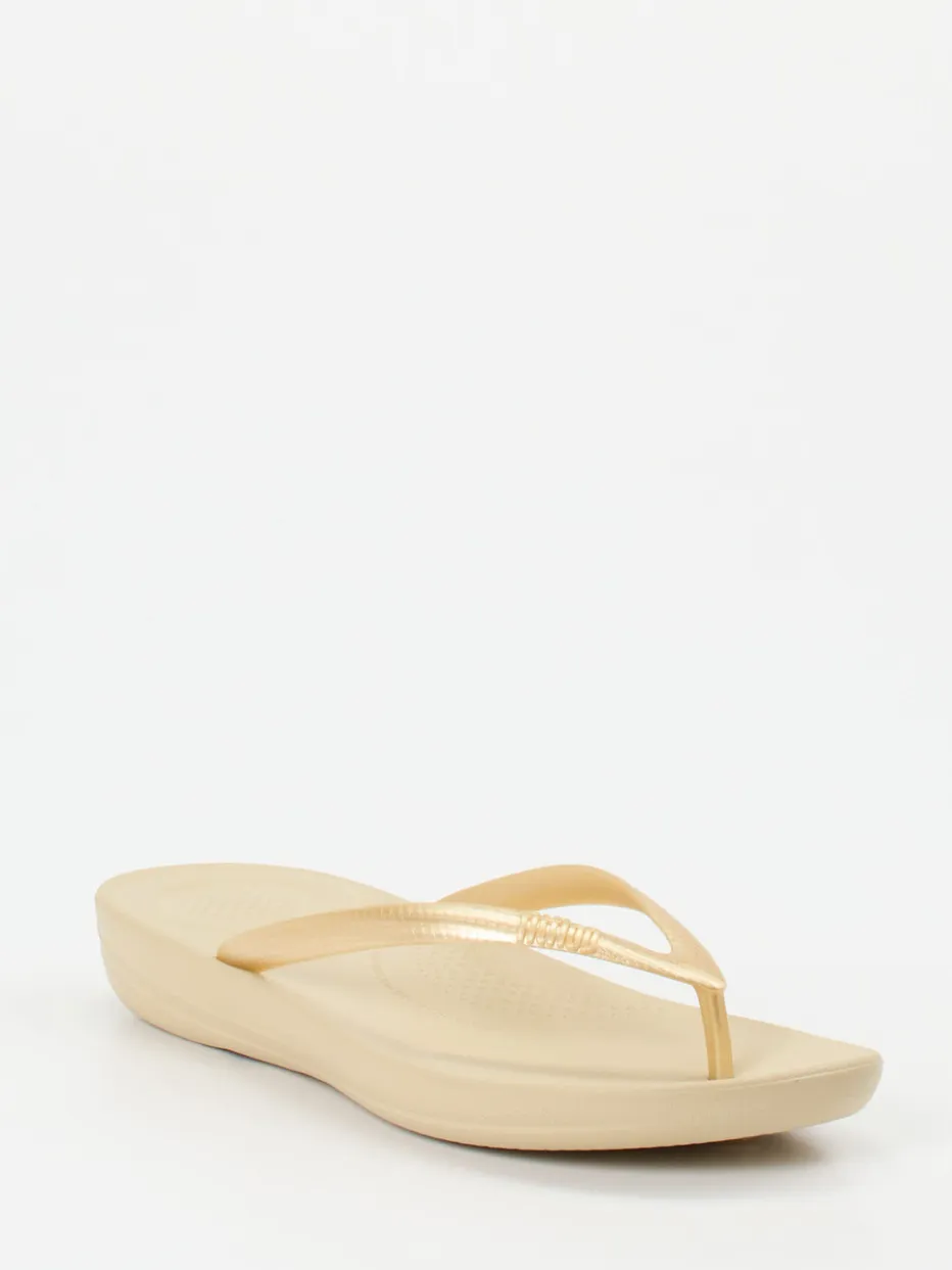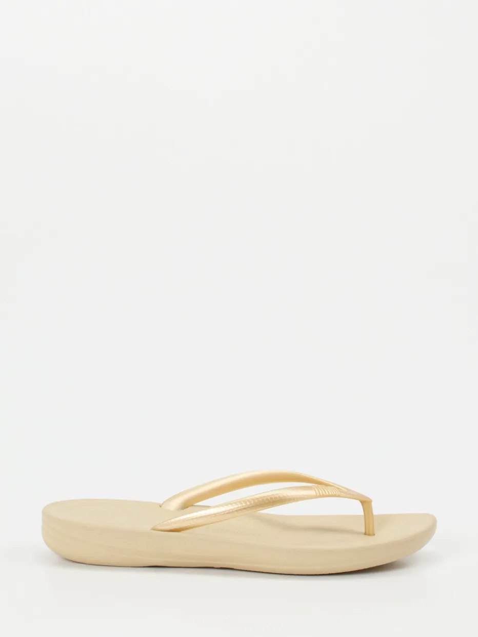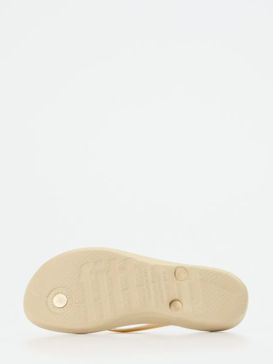 Urlaubskomfort trifft Minimalismus.FitFlop präsentiert eine Damen-Zehentrenner-Sandale mit Fokus auf Leichtigkeit und Tragekomfort. Die flache Silhouette aus wasserabweisendem Synthetik kombiniert ein ergonomisch geformtes Fußbett mit glänzenden, beigegoldenen Riemen. Die profilierte PU-Sohle sorgt für Stabilität, während der minimalistische Look aktuelle Trends wie Quiet Luxury und Metallic Accents aufgreift. Ideal für warme Tage zu Hause, am Pool oder auf Reisen. Styling-Tipp: Passt zu leichten Kaftans oder Badeanzug und Strandtasche. Design und Funktion in perfekter Balance – typisch FitFlop.