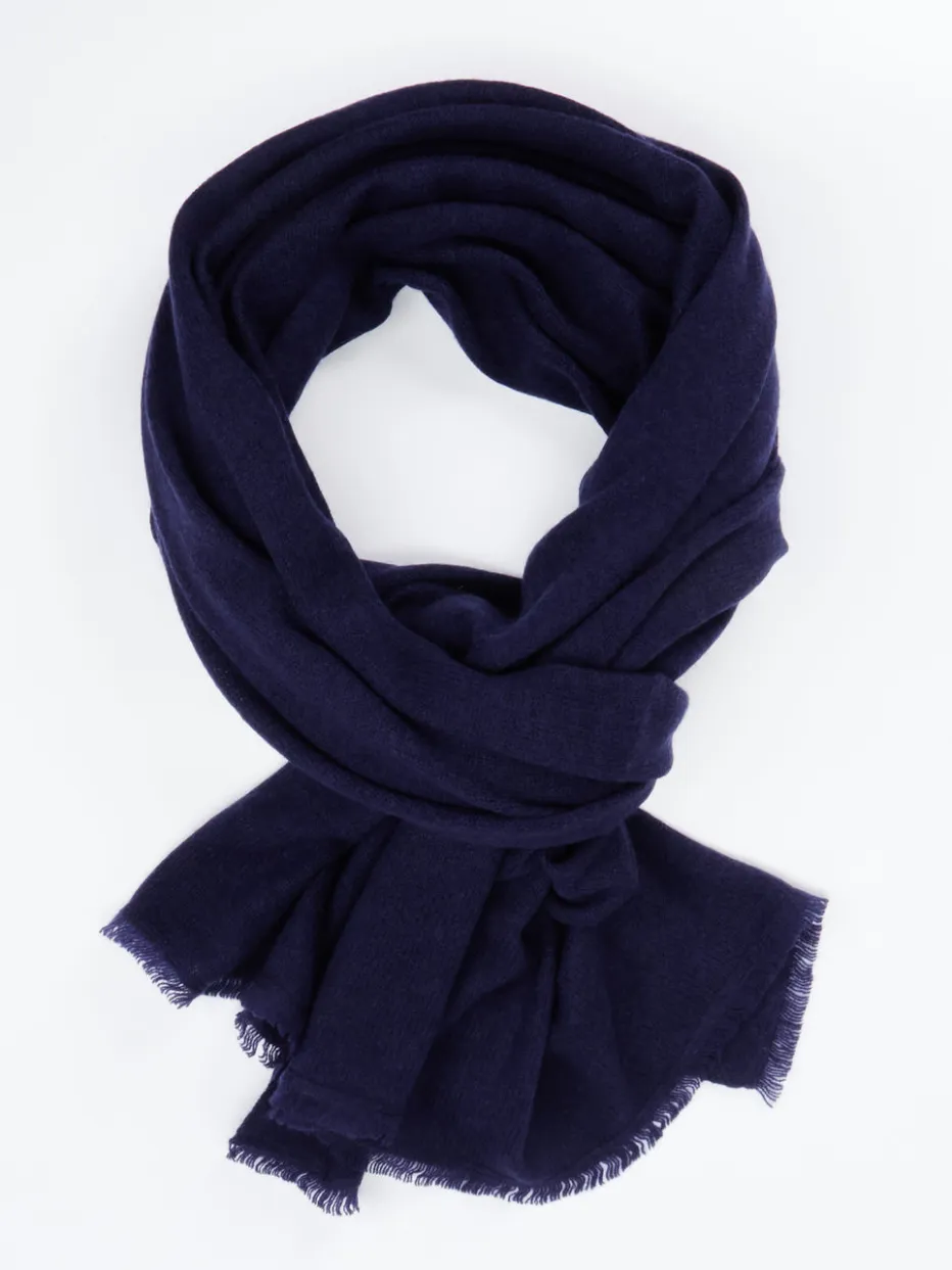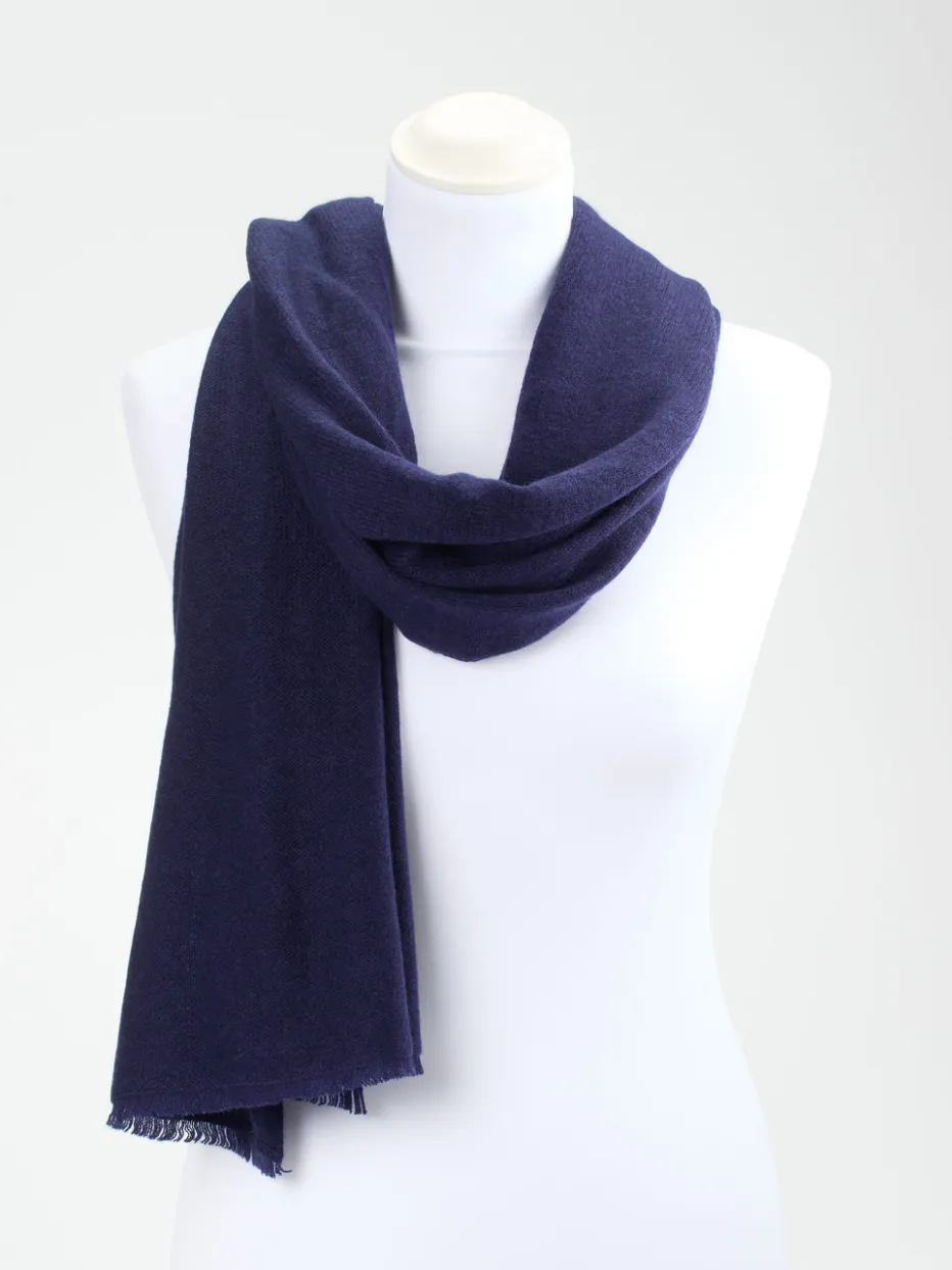 Dieser dunkelblaue Kaschmirschal begeistert mit edler Haptik und minimalistischem Design – ein stilvoller Begleiter für Büro und Alltag.