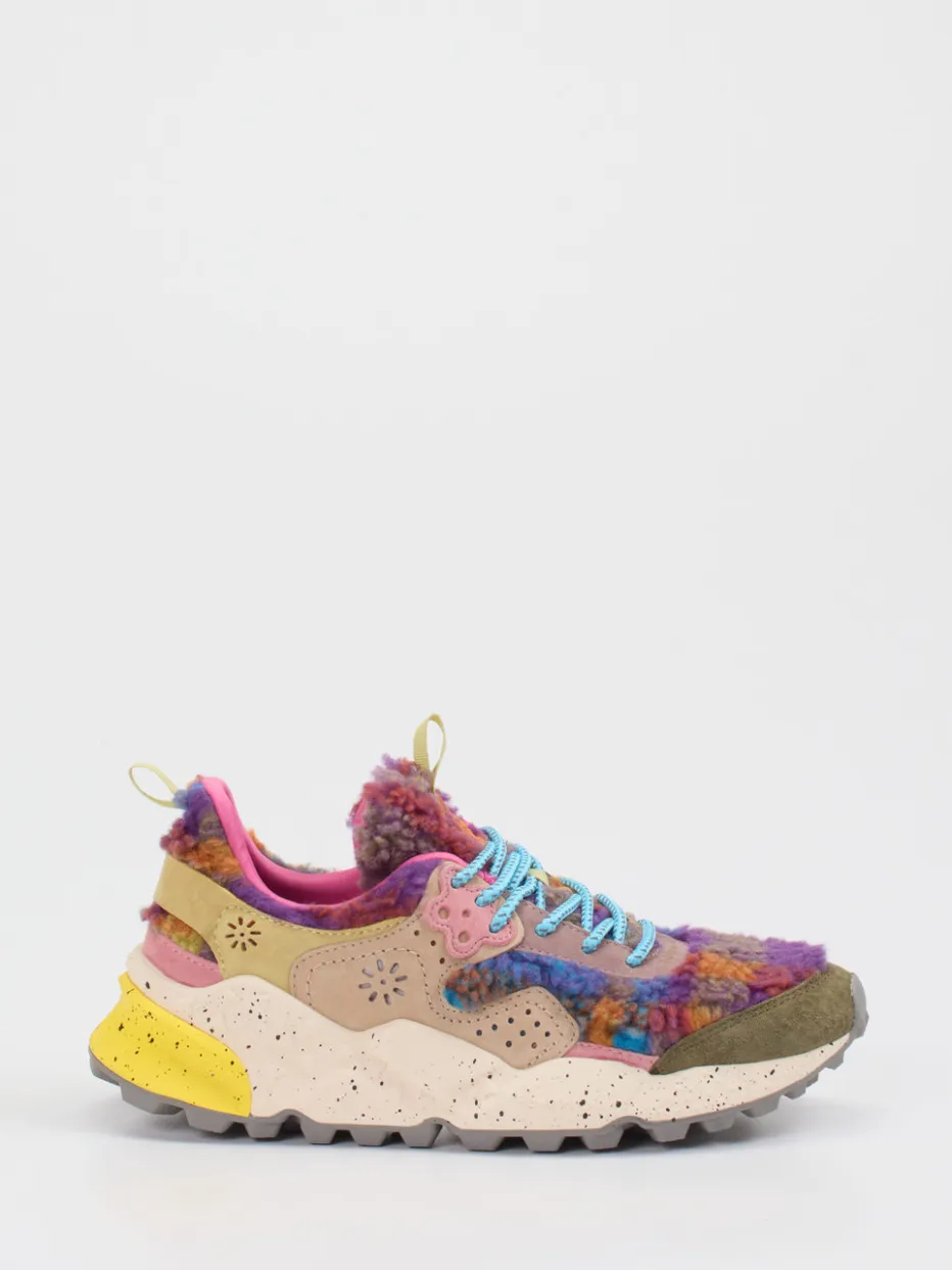 Unverkennbar urban – mit Outdoor-DNA.Mit diesem farbenfrohen Chunky-Sneaker präsentiert Flower Mountain einen expressiven Vertreter der Streetwear-Kultur. Die Kombination aus weichem Velour/Textil mit frotteeartiger Wollstruktur verleiht dem Modell eine markante Haptik und optische Tiefe. Cremebeige trifft auf Kontrastfarben wie Gelb, Hellblau und Lila – unterstrichen durch türkisfarbene Schnürsenkel und eine gesprenkelte Zwischensohle. Die verstärkte Fersenkappe und griffige Gummisohle bieten funktionale Stabilität für urbane Streifzüge oder Outdoor-Ausflüge im Gorpcore-Stil. Ideal in Kombination mit kontraststarken Jacken oder auffälligem Strick. Verbindet Design-Mut mit hochwertiger Verarbeitung und modischem Selbstbewusstsein.