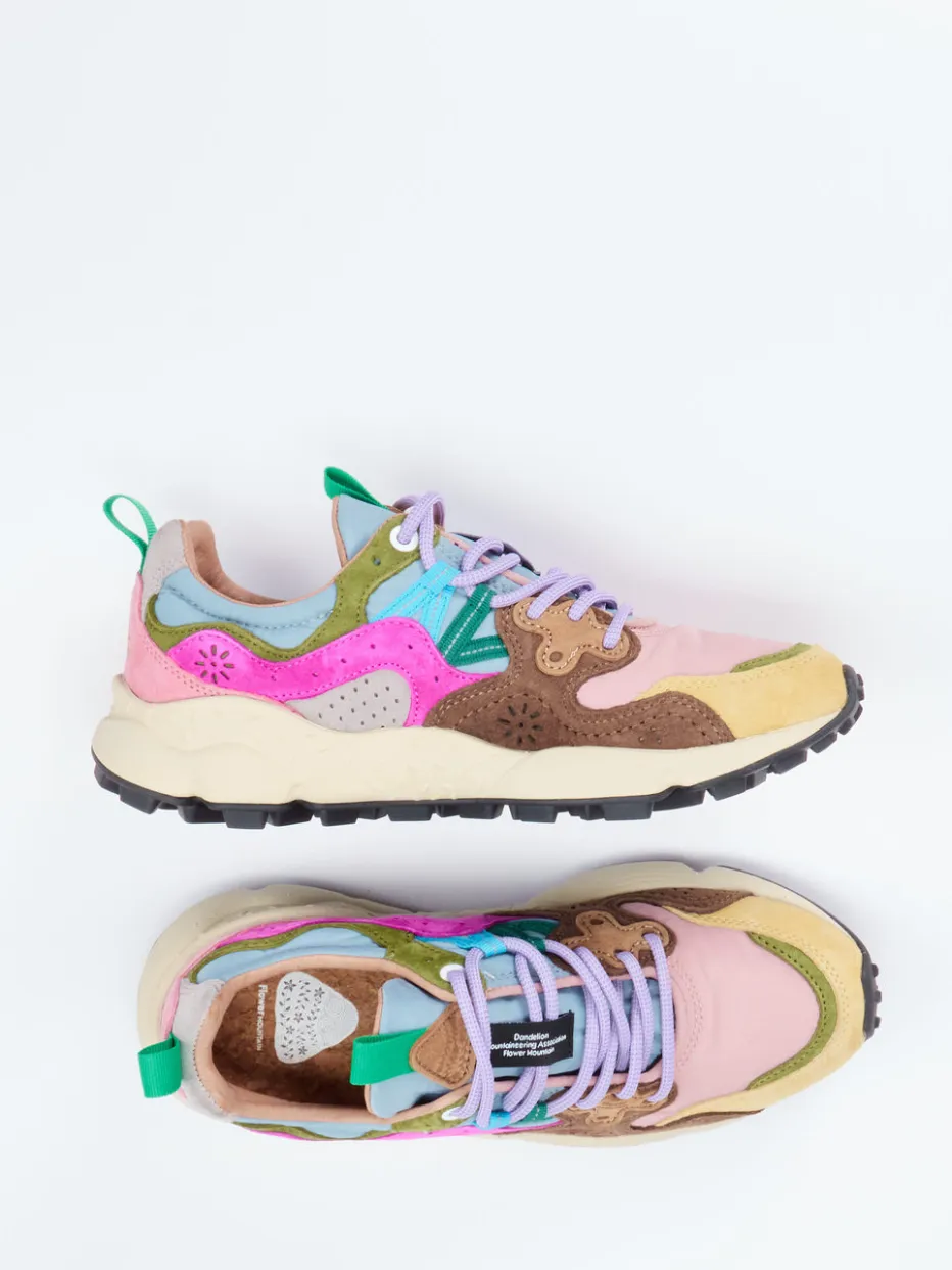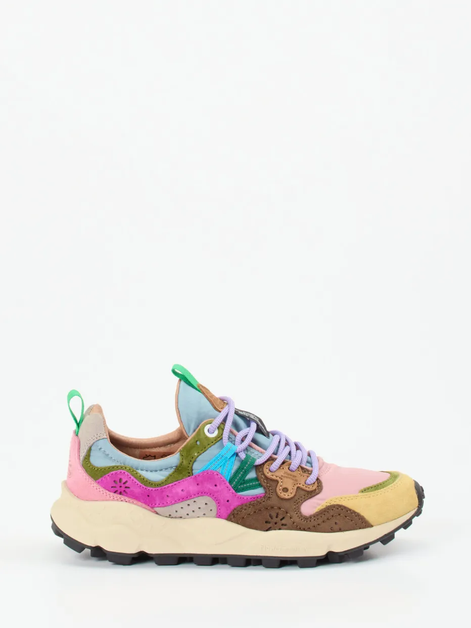 Mix aus Farbe, Funktion und Street-Style.Flower Mountain stellt mit diesem farbstarken Sneaker ein Statement-Modell für Outdoor-affine Looks vor. Ideal für Festival-Wochenenden oder urbane Abenteuer: Der Schuh kombiniert samtig mattes Veloursleder mit atmungsaktivem Textil und Patchwork-Einsätzen in Rosé, Flieder, Braun und Türkis. Die markant profilierte Gummisohle inspiriert sich am Trail-Look, während florale Perforationen, kontrastfarbene Schnürsenkel und eine sichtbare Kork-Innensohle modische Akzente setzen. Der Materialmix unterstützt eine leichte Konstruktion mit stabiler Silhouette. Ausdrucksstarke Farbgestaltung trifft bei Flower Mountain auf funktionales Design.
