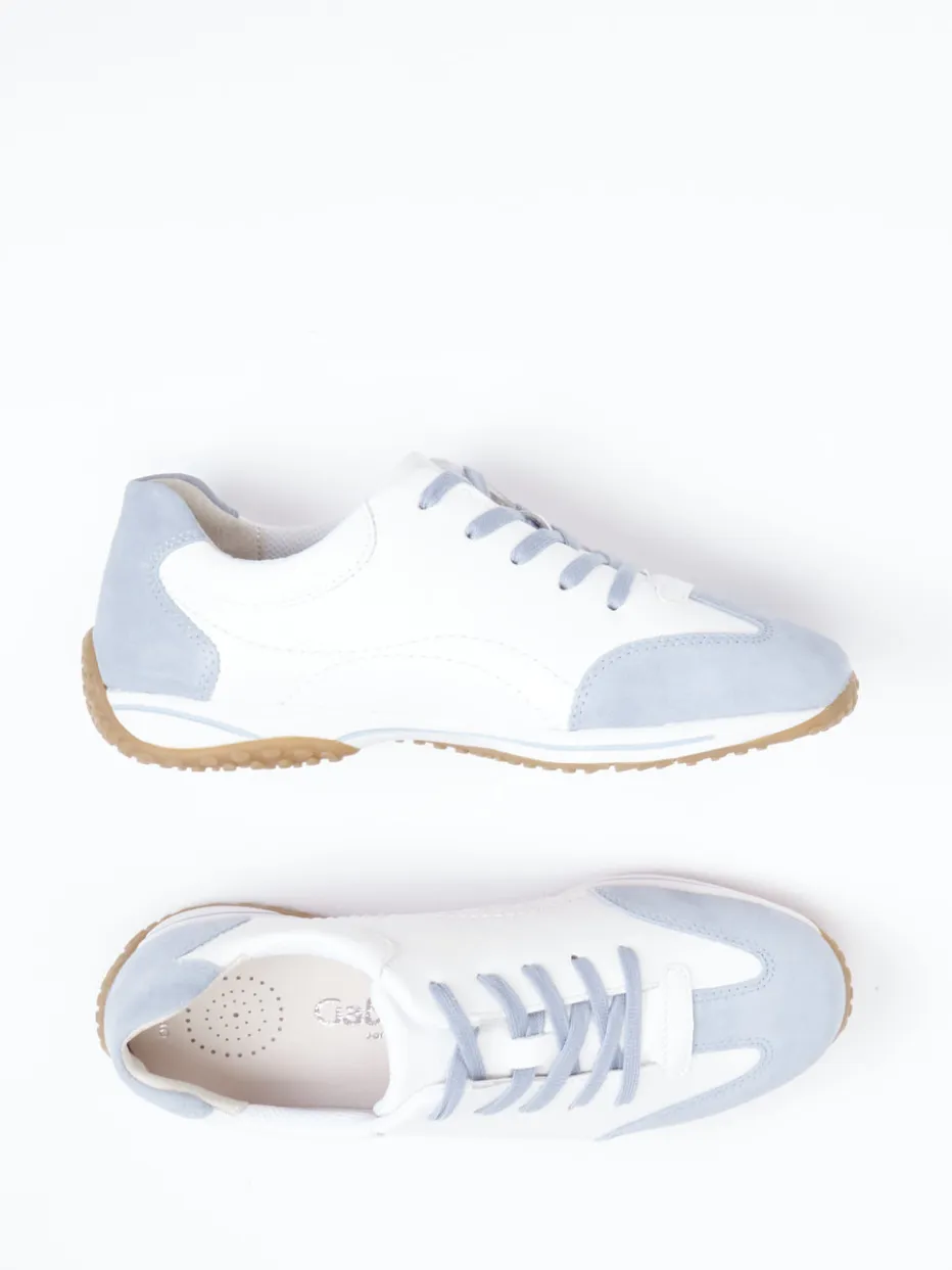 Moderner Komfort trifft Retro-Coolness.Gabor Comfort präsentiert einen Damen-Freizeitsneaker mit klassisch flacher Form und bequemen Sitz. Für entspannte Wege im Alltag punktet das Modell mit einer hochwertigen Kombination aus Velour/Leder – samtig angeschliffen in Pastellblau und Glattleder in Weiß. Die strukturierte Gummisohle mit Kontrastlinie sorgt für sicheren Tritt, während der weich gepolsterte Einstieg sowie das atmungsaktive Textilfutter ein rundum angenehmes Tragegefühl bieten. Die Ton-in-Ton-Nähte, das reduzierte Design und retroinspirierte Anklänge ergänzen aktuelle Minimalismus-Trends perfekt. Passt hervorragend zu luftigen Baumwollhosen und pastelligen Accessoires. Leichter City-Sneaker mit Gabor-typischer Komfortausstattung.