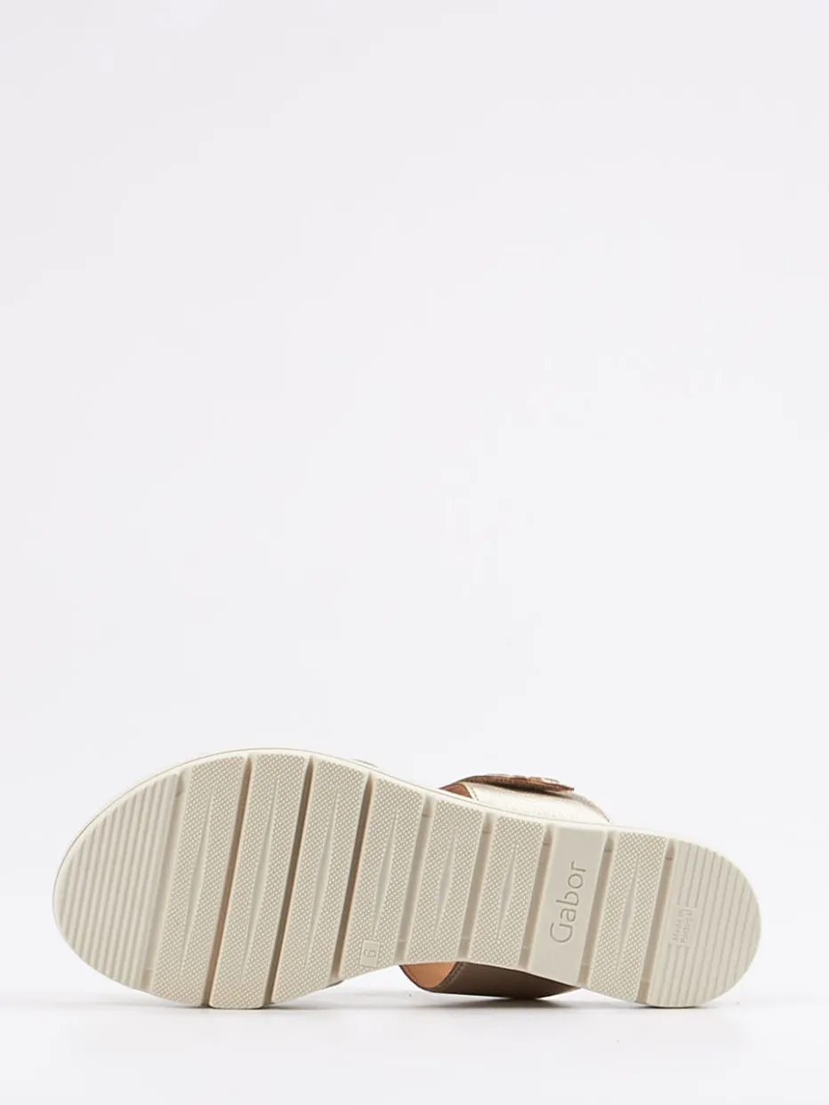Glänzender Komfort für Sommertage.Gabor Comfort präsentiert eine stilvolle Komfort-Pantolette für Damen. Ob auf Reisen oder beim Stadtbummel – das gepolsterte Fußbett und die ergonomische Form sorgen für ganztägigen Tragekomfort. Das fein genarbte Metallicleder in Champagner verleiht den offenen Riemen eine edel-glänzende Note, ergänzt durch einen dezenten Klettverschluss für perfekte Passform. Die rutschhemmende Gummisohle mit angesetztem Korkstreifen bringt Leichtigkeit und sommerliche Frische ins Design. Inspiriert vom Comfort-Revival-Trend, harmoniert der Look ideal mit entspannten Outfits wie Leinenhosen. Ein gelungener Mix aus Funktion, Stil und spürbarer Wohlfühlqualität von Gabor Comfort.