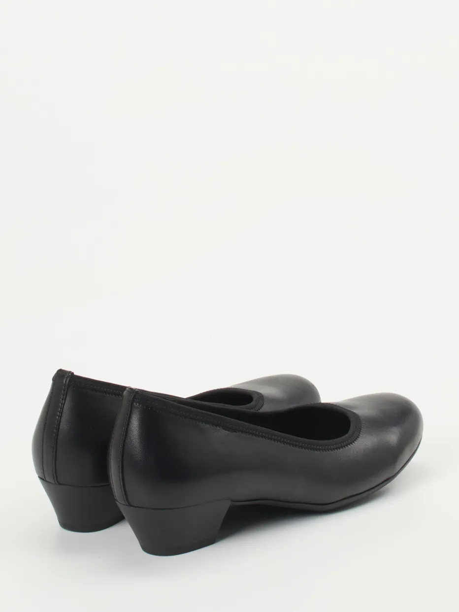 Ob im Büro oder in der Freizeit – dieser Komfortpumps erfüllt den Anspruch an ein stilvolles Erscheinungsbild und angenehmes Laufgefühl. Das schwarze Kalbleder wirkt durch seine matte Oberfläche edel-zurückhaltend. Ein runder Leisten mit weitem Dekolleté formt eine feminine, abgerundete Silhouette, ergänzt durch einen bequemen Blockabsatz und eine profilierte Gummisohle. Schlupfschuhkonstruktion, vollledernes Innenfutter und die H-Weite verstärken den Komfortanspruch. Ein gelungener Begleiter zu monochromen Business-Outfits oder klassischen Freizeit-Looks.