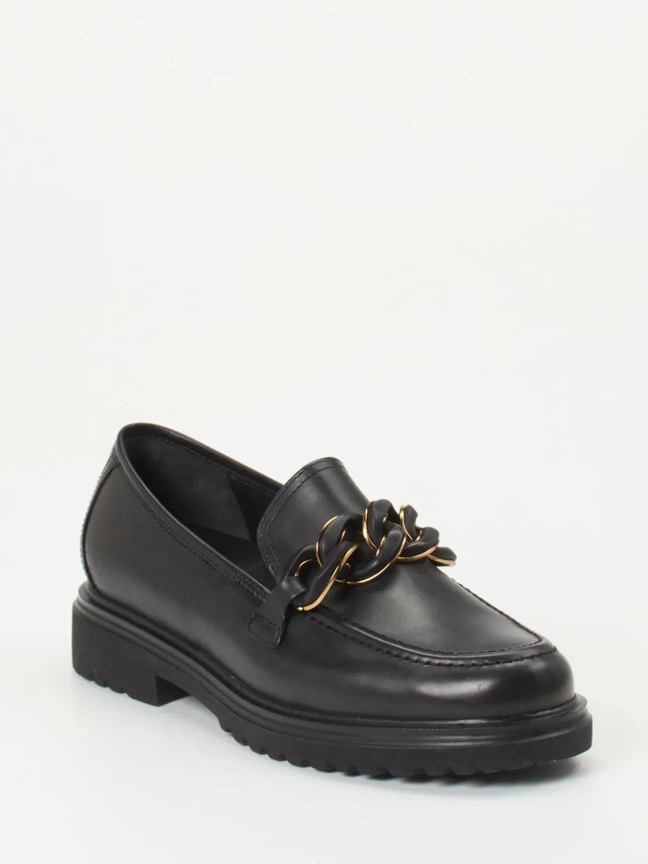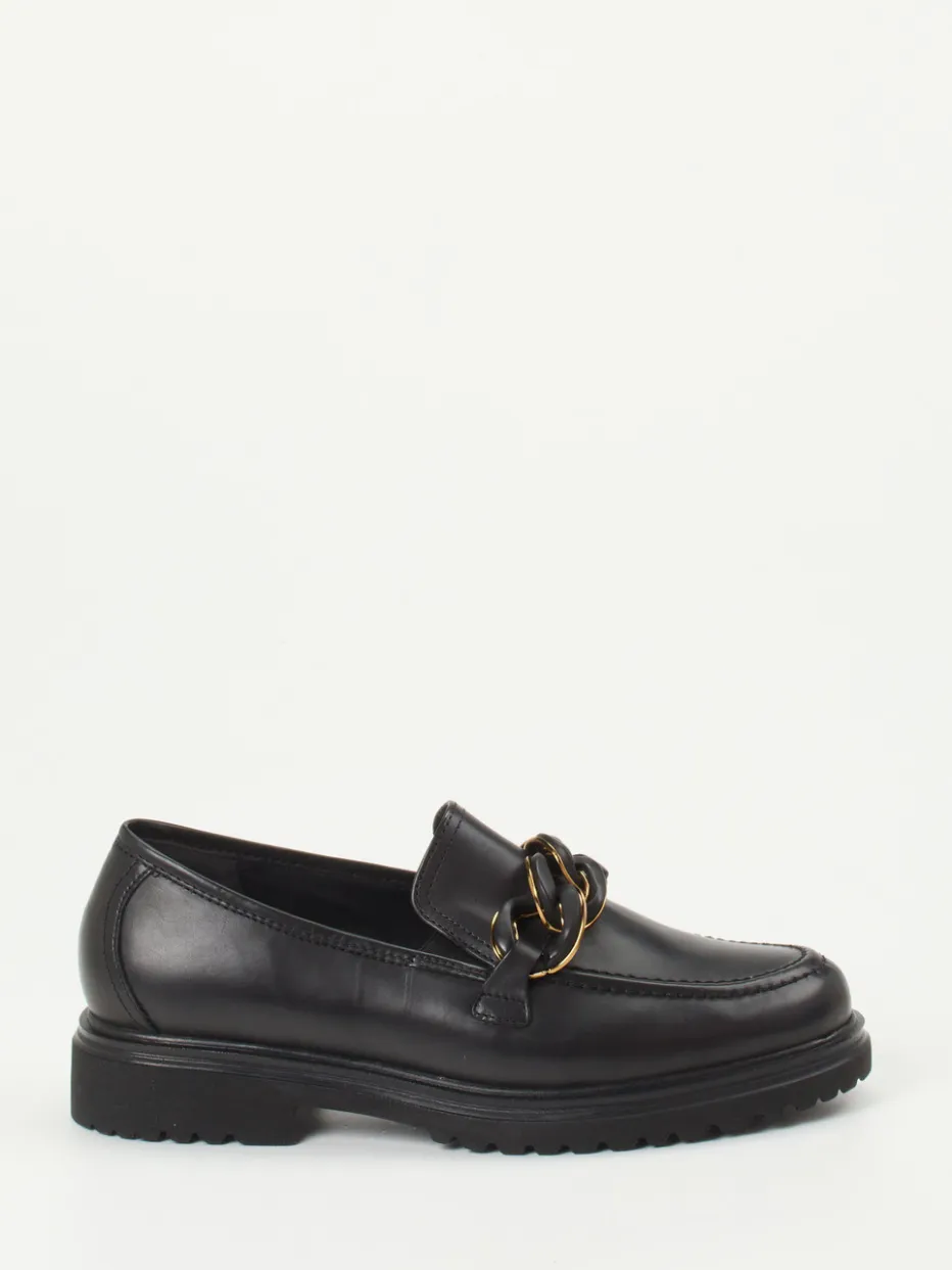 Stilvoll auftreten mit Komfortanspruch.Der Damen-Loafer von Gabor Comfort überzeugt als bequemer Trotteur mit eleganter Note. Für den urbanen Alltag und den gepflegten Büro-Look bietet dieses Modell aus schwarzem Kalbleder eine stilvolle Lösung. Eine goldfarbige Kettendekoration auf dem Blatt setzt einen wertigen Akzent. Die rutschhemmende Chunky-Profilsohle in Kombination mit der komfortablen Weite H und einem gepolsterten, herausnehmbaren Fußbett sorgt für angenehmen Tragekomfort. Die matte Lederoberfläche unterstreicht den minimalistischen Charakter, während dezente Streetwear-Einflüsse Modernität signalisieren. Perfekt kombinierbar zu Tailored Pants oder Strickkleid. Gabor Comfort steht für passformgerechtes Design mit stilistischer Präzision.