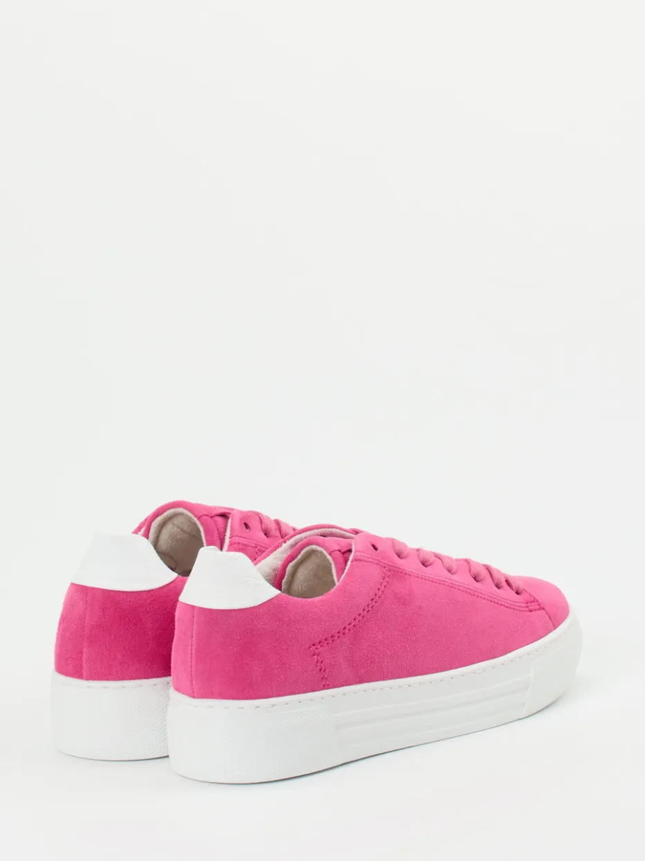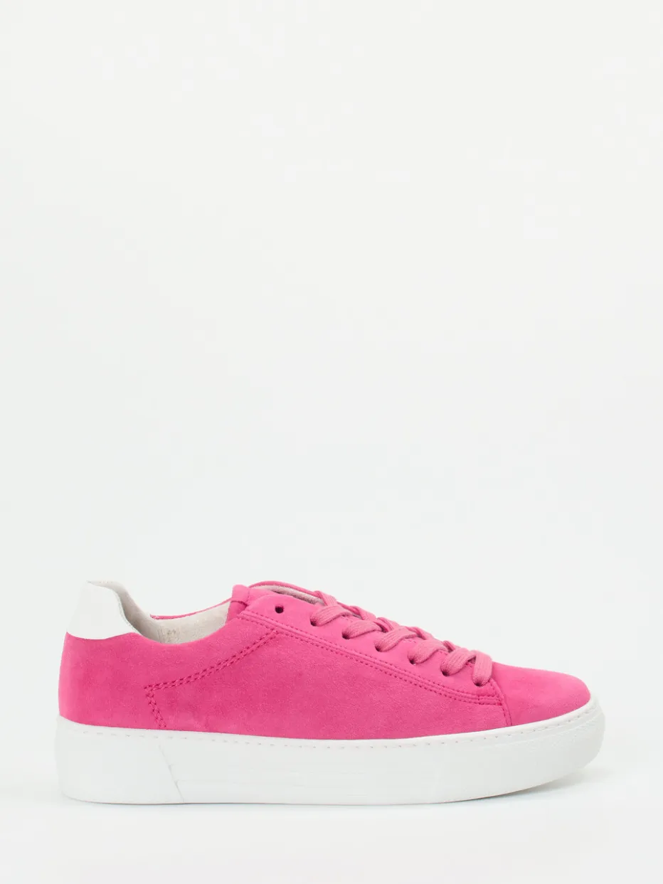 Farbakzent für urbane Sommer-Looks.Die Marke Gabor Comfort präsentiert einen femininen Plateau-Sneaker für Alltag und Freizeit. Ideal für sommerliche Städte-Trips oder entspannte Tage am Strand: Das pinkfarbene Veloursleder ist samtig angeschliffen und wird durch eine weiße Kontrast-Fersenkappe betont. Das klassisch-runde Design mit Plateausohle wirkt modern und bequem. Die profilierte Gummisohle bietet Rutschfestigkeit, das austauschbare Fußbett sorgt für zusätzlichen Komfort. Farbakzente und Streetwear-inspirierte Details machen diesen Schuh zum beliebten Trendmodell. Gabor Comfort steht für modisches Wohlgefühl in hochwertiger Verarbeitung.