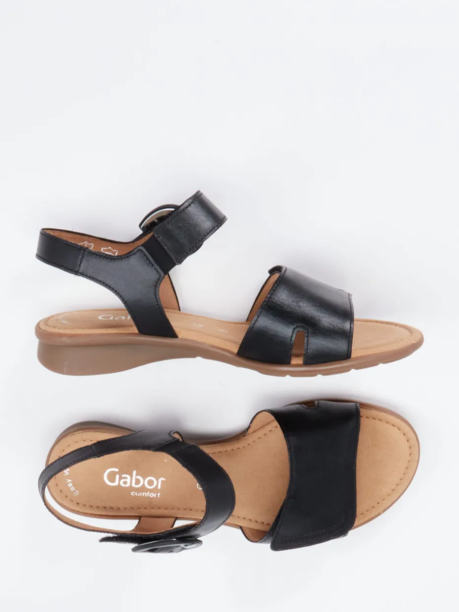 Sommerkomfort in klarer Form.Gabor Comfort präsentiert mit diesen Sandalen ein Damenmodell, das auf funktionale Eleganz setzt. Ideal für entspannte Sommertage: Weiches schwarzes Kalbleder trifft auf eine ergonomisch geformte Gummisohle mit beige abgesetztem Profil. Der breite Riemen mit Klettverschluss sorgt für Komfort im Alltag, während der verstellbare Knöchelriemen mit toniger Schnalle eine individuelle Passform ermöglicht. Die gepolsterte Decksohle, das atmungsaktive Microfaserfutter sowie die offene, luftige Silhouette runden das komfortbetonte Design ab. Perfekt kombinierbar mit Leinenhose oder Sommerbluse. Langlebiger Gehkomfort und zeitlose Zurückhaltung in Gabor Comfort Qualität.