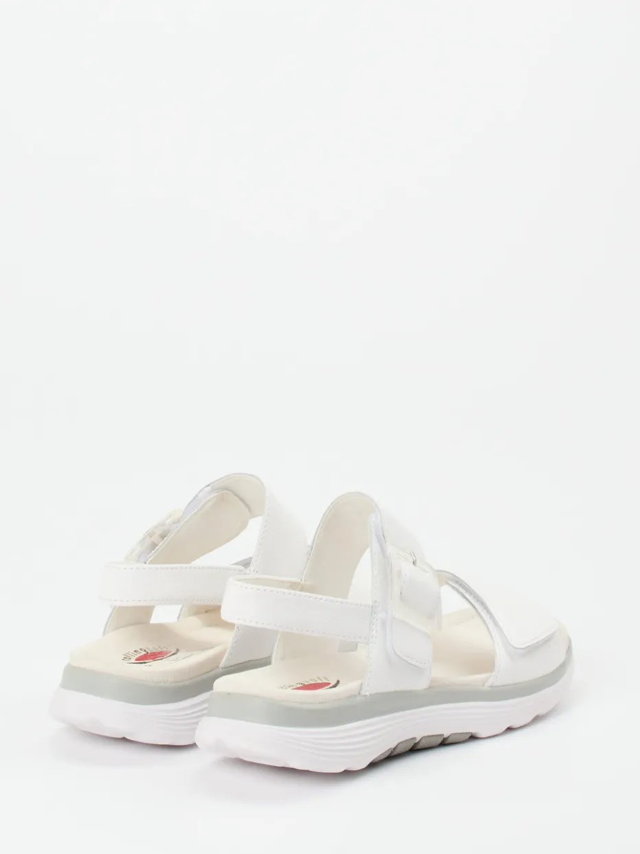 Diese ergonomisch geformte Komfortsandale überzeugt durch schneeweißes Kalbleder, funktionale Klettverschlüsse und ein gepolstertes Fußbett mit Fersendämpfung – ideal für stilvollen Alltag und entspanntes Gehen.