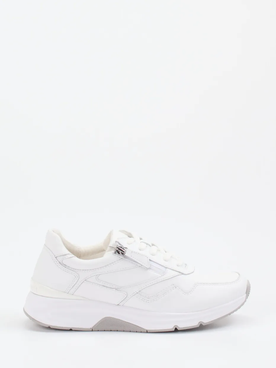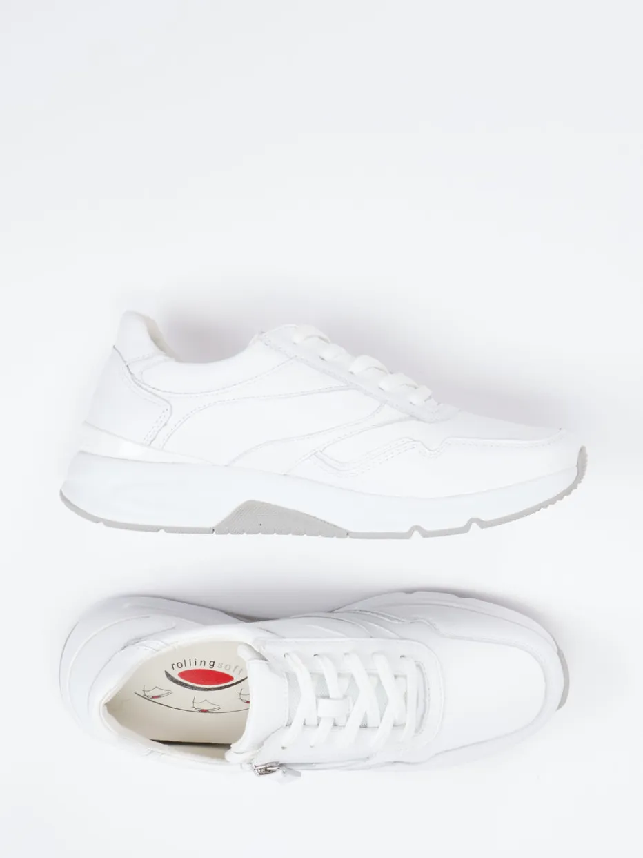 Streetwear trifft Komfort.Der weiße Sneaker von Gabor Comfort aus der Rollingsoft-Kollektion vereint minimalistische Optik und durchdachten Komfort. Für dynamische Alltagssituationen bietet er mit seinem weichen Kalbleder, mattierter Oberfläche und tonalen Nähten stilvolle Zurückhaltung. Die sportlich-abgerundete Form wird durch die flexible Schnürung und einen funktionalen Seitenreißverschluss ergänzt. Das Innenfutter aus Leder und Textil sowie ein herausnehmbares Fußbett sorgen für ein angenehmes Tragegefühl. Die weiße Gummisohle mit Profil unterstreicht den aktiven Charakter. Dank der cleanen Farbgebung fügt sich der Sneaker vielseitig in casual-urbane Outfits. Komfortstarkes Design mit klarer Formensprache – typisch Gabor Comfort.