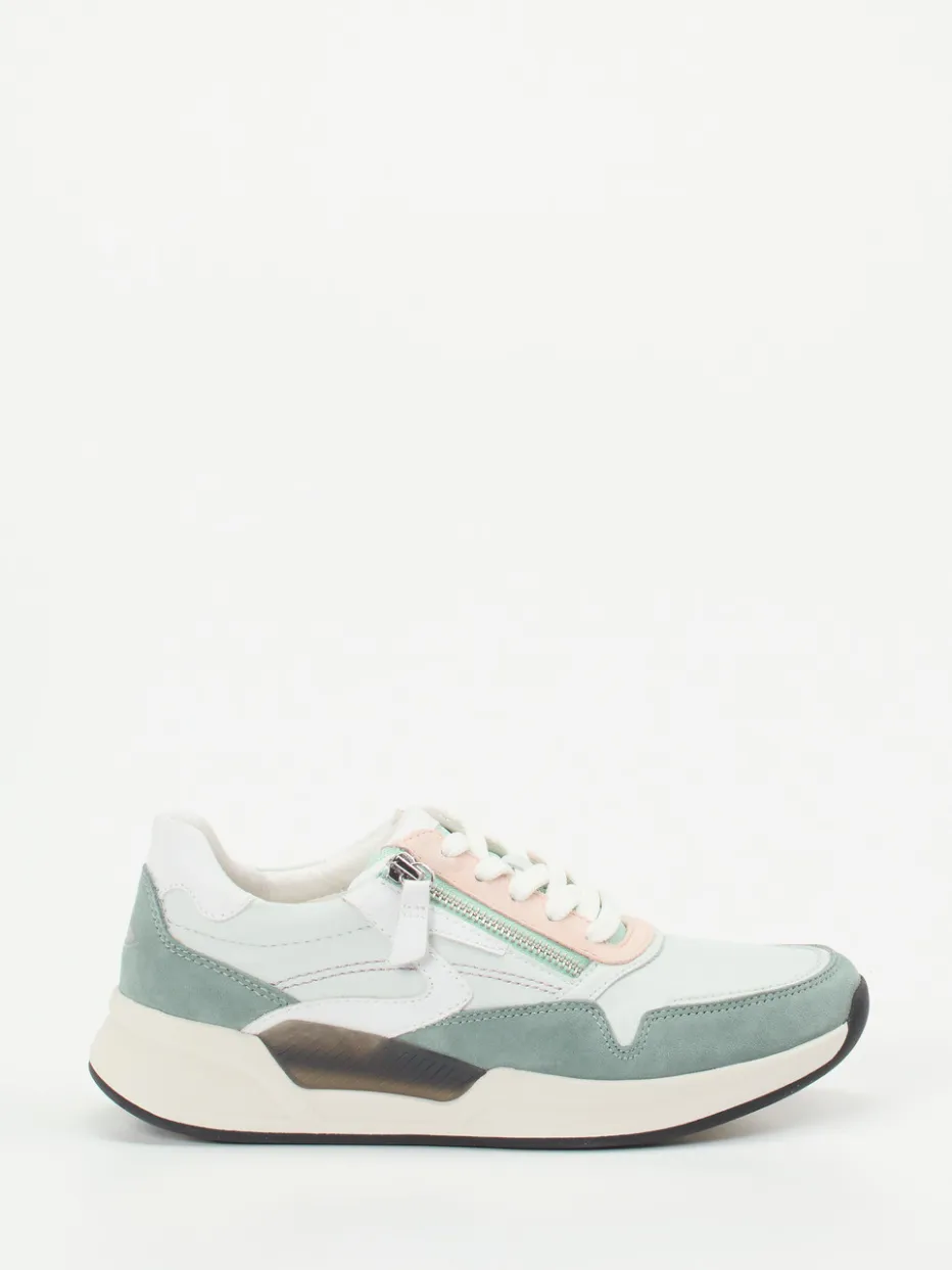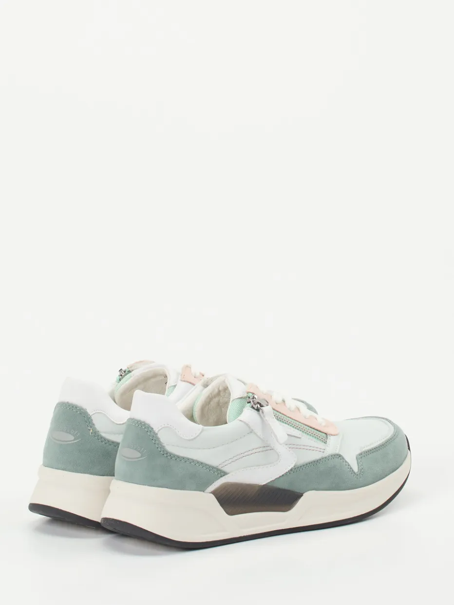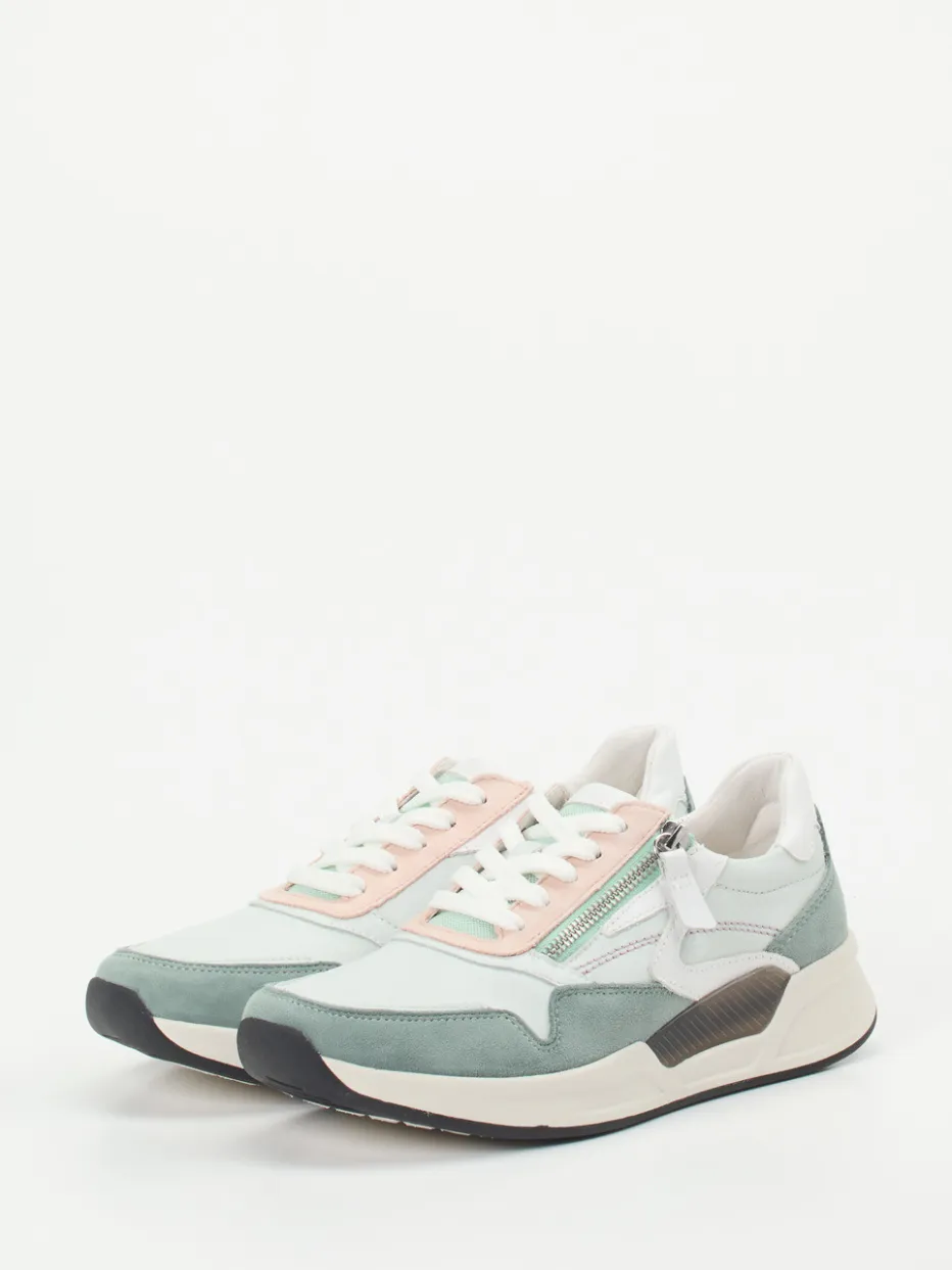 Perfekt für den Alltag: Das butterweiche Kalbleder mit samtigem Veloursleder setzt in Mintgrün, Rosé und Weiß zarte Akzente. Der sportlich-voluminöse Schnitt wird durch eine kontrastierende Gummisohle und weiche Polsterung ergänzt. Schnürung und Reißverschluss bieten flexible Weitenanpassung, das Wechselfußbett maximiert den Tragekomfort. Pastelltöne und Chunky-Form machen den Sneaker zum Frühlingshighlight für casual Looks.