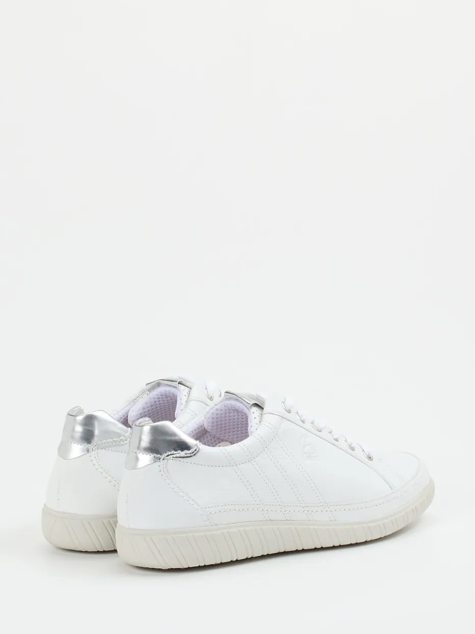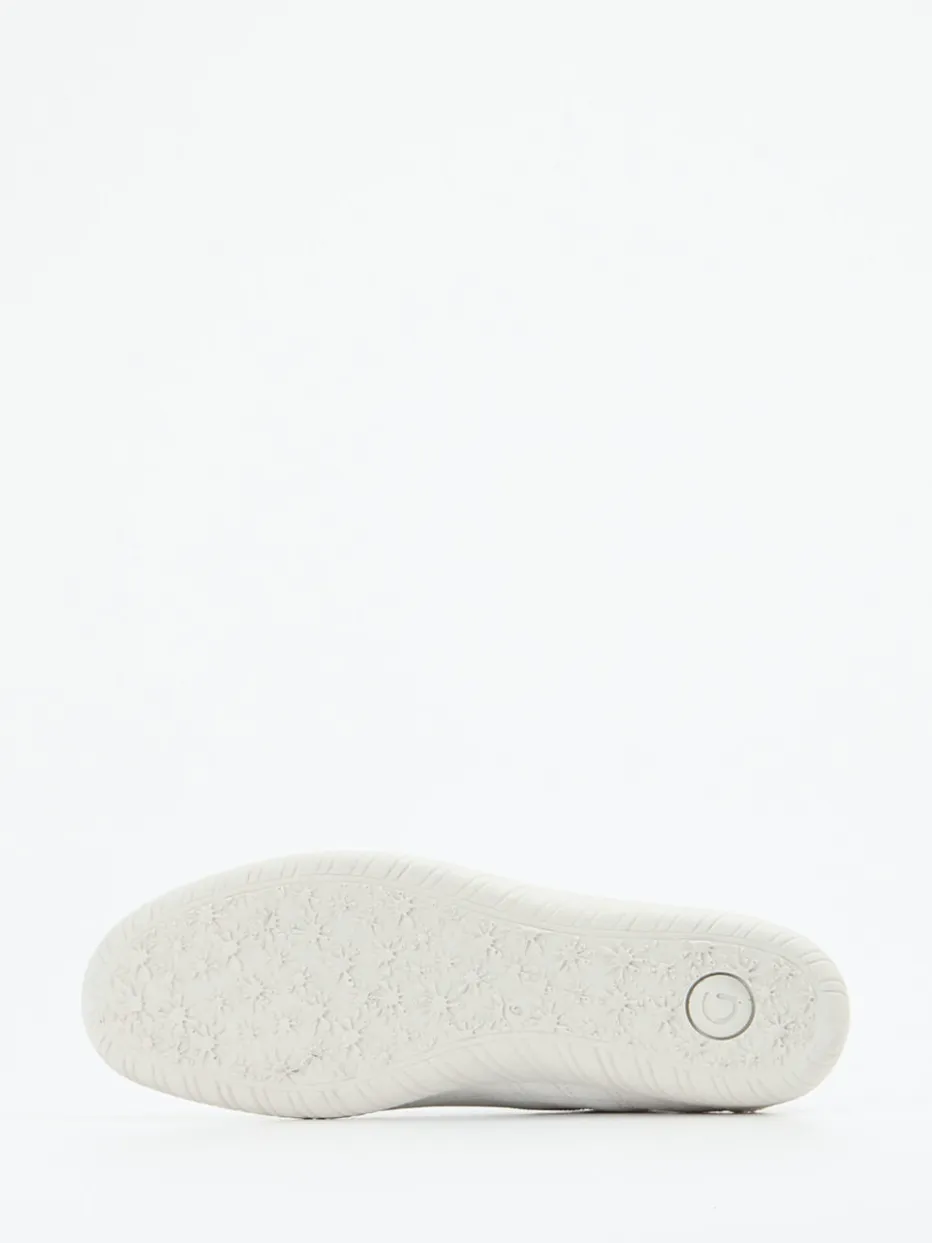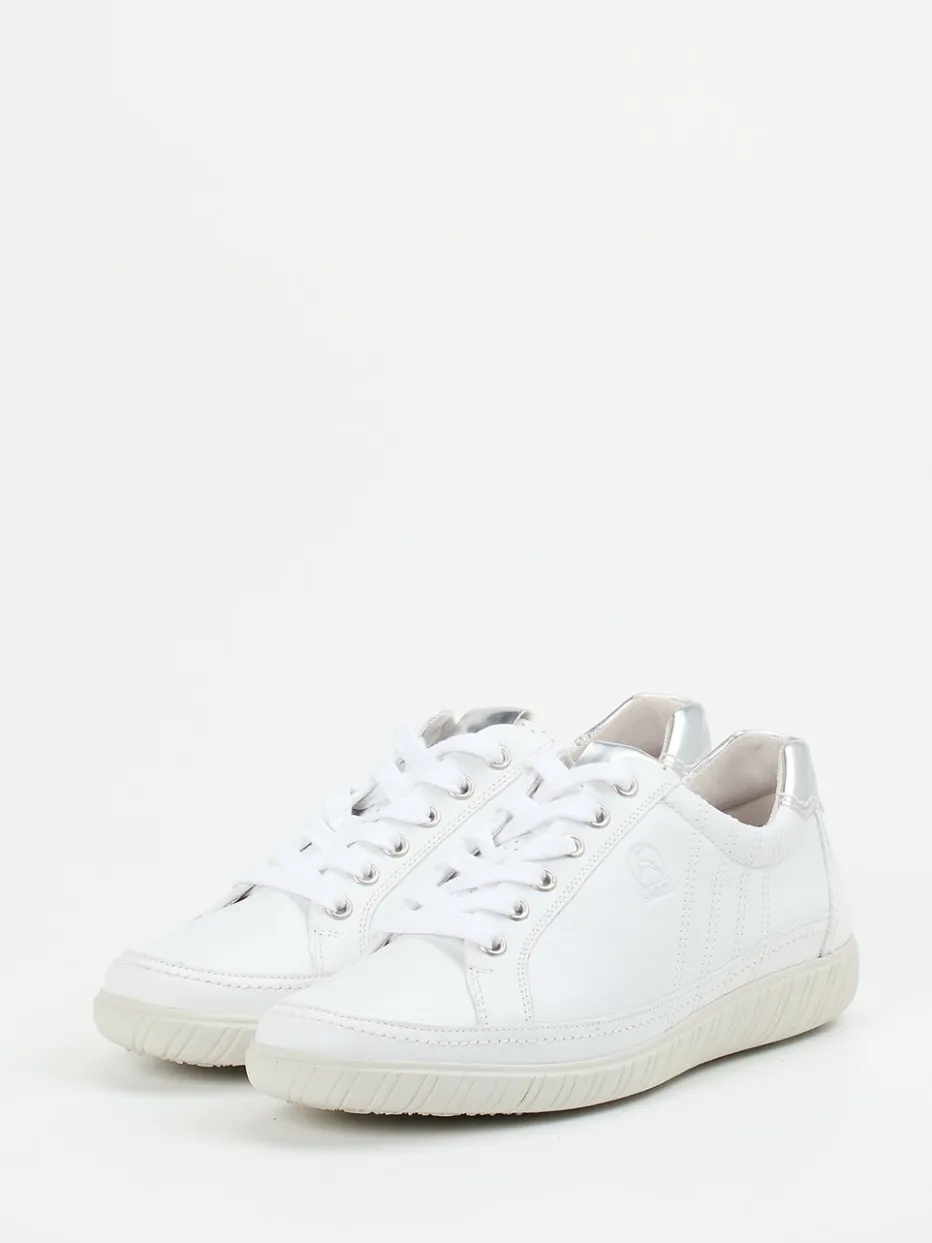 Cleanes Design trifft bequeme Verarbeitung.Gabor Comfort präsentiert einen weißen Damen-Sneaker mit klarem Fokus auf Komfort und Stil. Ob beim Stadtbummel oder an langen Arbeitstagen – dieser Schnürschuh überzeugt durch feines Kalbleder mit matter Oberfläche und silberfarbene Akzente an Ösen und verstärktem Fersenbesatz. Die klassische Form mit flacher Sohle aus flexiblem PU sorgt für ein angenehmes Tragegefühl und sicheren Halt. Innen bietet ein hochwertiges Hightech-Mesh-Futter Atmungsaktivität, während die gepolsterte Einlegesohle austauschbar ist. Minimalistische Linienführung und cleane Farbgebung machen ihn zum vielseitigen Kombipartner für sportlich-legere Looks. Bequemer Stil von Gabor Comfort trifft urbanen Purismus.