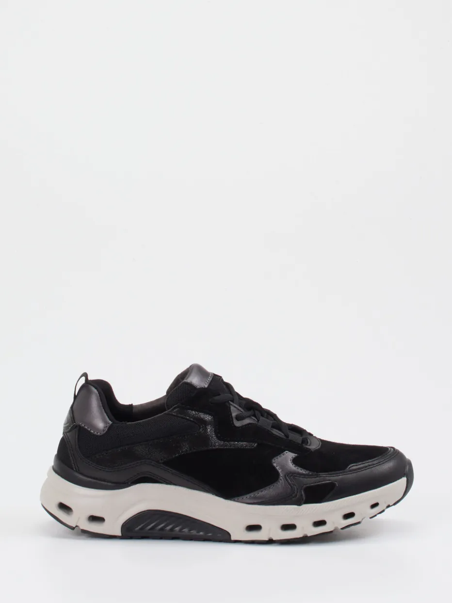 Streetstyle trifft Ergonomie.Dieser voluminöse Sneaker von Gabor Comfort vereint funktionales Design mit modischer Chunky-Ästhetik. Sein edler Materialmix aus schwarzem Veloursleder, Kalbleder-Overlays und Mesh bringt subtile Texturwechsel ins Spiel. Die kontrastierende Sohle mit Luftkanälen sorgt für ein aktives Laufgefühl, während glänzende Partien am Schaft den Tech-Look unterstreichen. Durch das gedämpfte Fußbett und die optimierte Fersenstabilität eignet er sich ideal für lange Alltagseinsätze oder sportlich geprägte Casual-Outfits. Die Kombinierbarkeit mit Nylon-Accessoires unterstreicht seinen Gorpcore-Charakter. Gabor Comfort steht für stilvolle Bewegungsfreiheit mit orthopädischer Raffinesse.