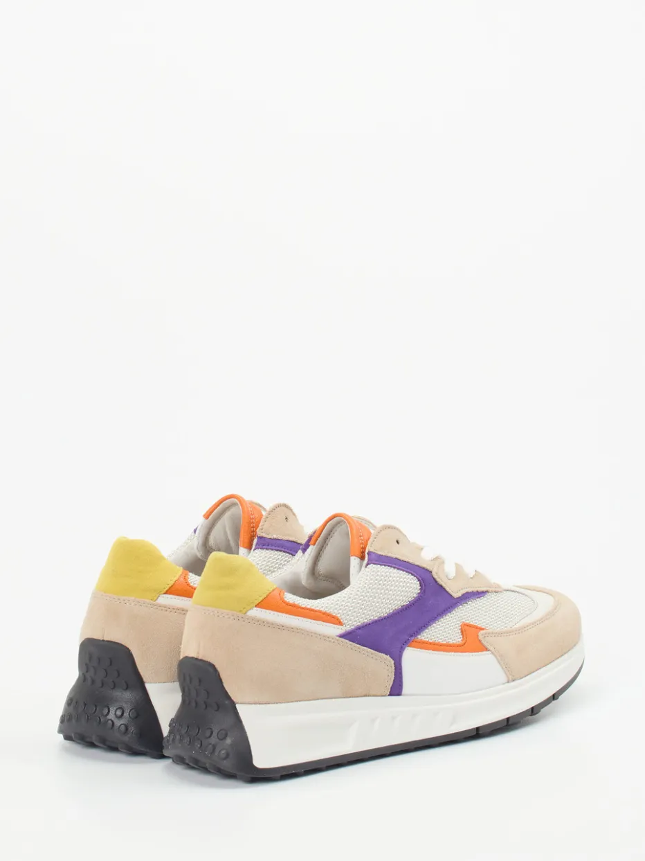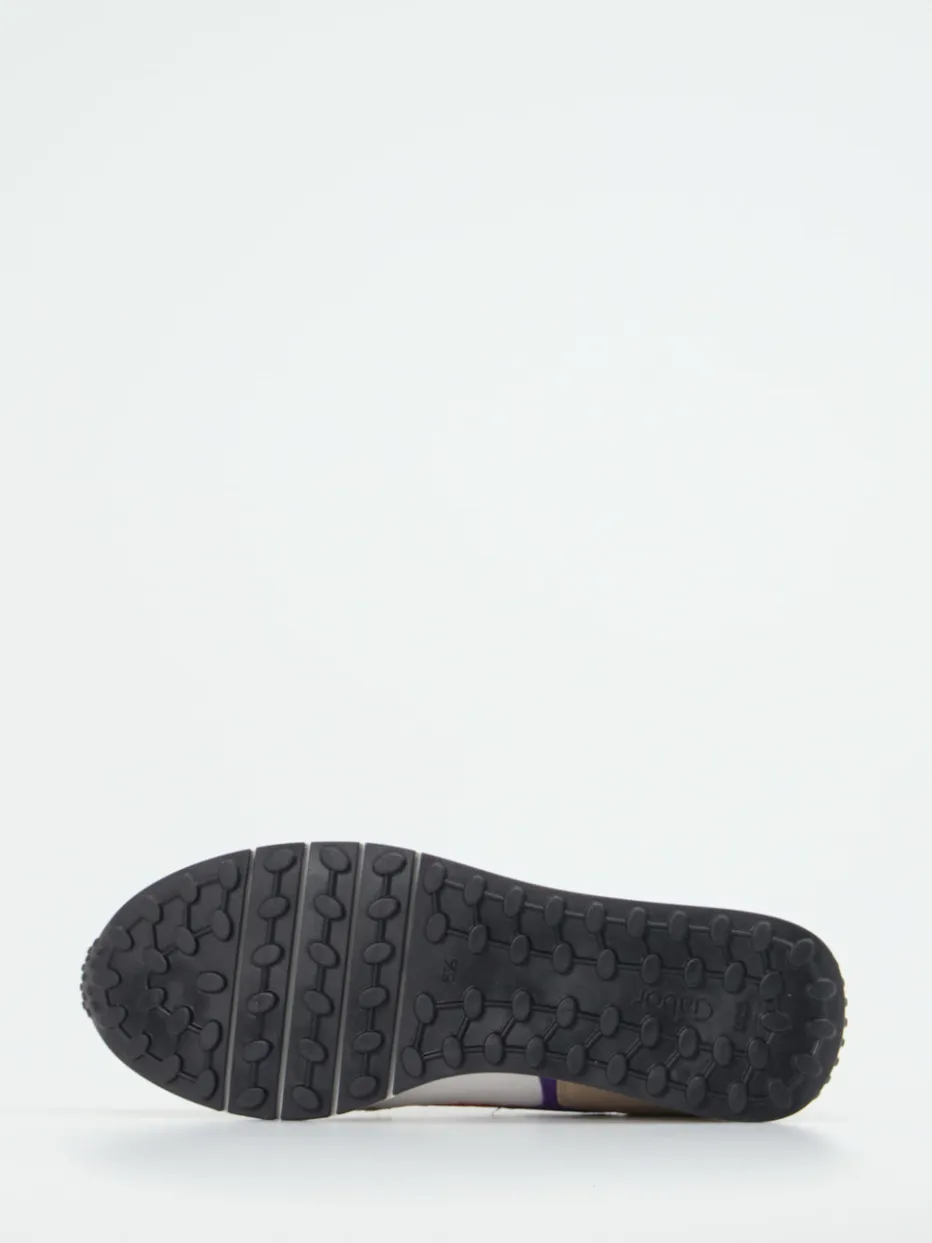 Color-Blocking modern umgesetzt.Gabor Comfort präsentiert diesen Damen-Sneaker im Retro-Runner-Stil. Ideal für lässige City-Tage oder Urlaubsausflüge verbindet das Modell beigefarbenes Veloursleder, samtig angeschliffen, mit weißen Mesh-Einsätzen und farbigen Overlays in Violett, Orange und Gelb. Die sportliche Schnürung sorgt für sicheren Halt, während die profilierte Gummisohle mit hochgezogenem Zehen- und Fersenbereich Trittsicherheit bietet. Dank Weite H, gepolsterter Ausstattung und wechselbarem Fußbett überzeugt der Sneaker auch komfortorientierte Zielgruppen. Das Design greift den aktuellen Color-Blocking-Trend auf und passt zu Streetwear genauso wie zu sommerlichen Casual-Looks. Komfort trifft auf modische Raffinesse – typisch Gabor Comfort.
