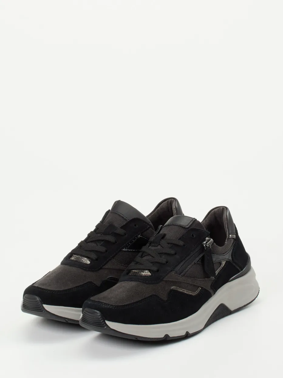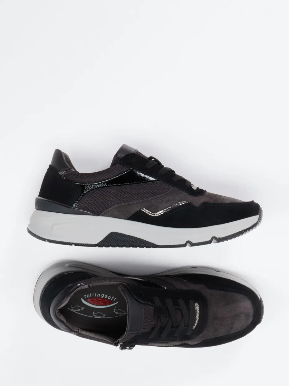 Design trifft Funktion neu gedacht.Dieser Komfortsneaker von Gabor Comfort verbindet dezentes Design mit Alltagstauglichkeit. Ideal für lange Tage voller Bewegung bietet der Damenschuh durch weiches Veloursleder mit samtiger Textur und atmungsaktives Mesh einen angenehmen Tragekomfort. Die Farbkombination aus Anthrazitgrau und Dunkelgrau wirkt stilvoll zurückhaltend, während glänzende Lackoverlays und silberne Metallic-Akzente modische Highlights setzen. Die betont sportliche Silhouette mit rutschfester Gummisohle sorgt für sicheren Auftritt, ein seitlicher Reißverschluss ergänzt die variable Schnürung funktional. Akzentuiert wird der Look durch subtile Branding-Elemente. Weich gepolstert und dämpfend – für modern interpretierten Tragekomfort von Gabor Comfort.