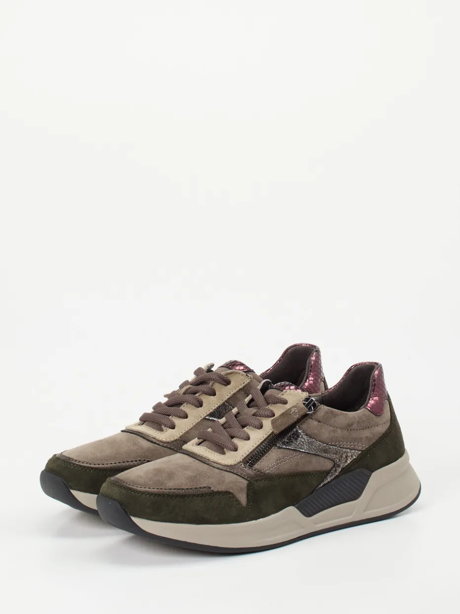 Design trifft Funktion: Komfort neu interpretiert.Der Damen-Komfort-Sneaker von Gabor Comfort vereint modischen Anspruch mit funktionalen Details. Taupefarbenes Veloursleder sorgt in Kombination mit olivgrünen Textilpartien und brombeerfarbenen Metallic-Overlays in Schlangenoptik für einen stilvoll-herbstlichen Auftritt. Die klassisch-sportliche Silhouette mit Kontrastnähten, Reißverschluss und gepolstertem Schaftrand bietet alltagsfreundlichen Komfort. Unterstützt wird das angenehme Tragegefühl durch das wechselbare Fußbett und die Rollsohlen-Gummisohle mit Fersendämpfung. Ein idealer Begleiter für Freizeitaktivitäten mit Anspruch an Komfort und Stil. Gabor Comfort steht für moderne Bequemlichkeit mit hochwertigem Materialmix.