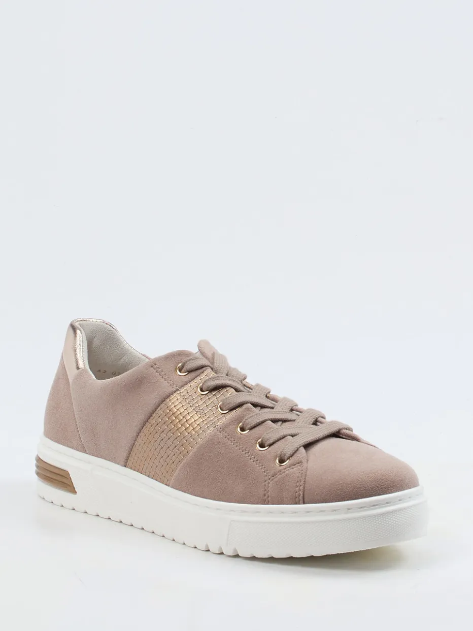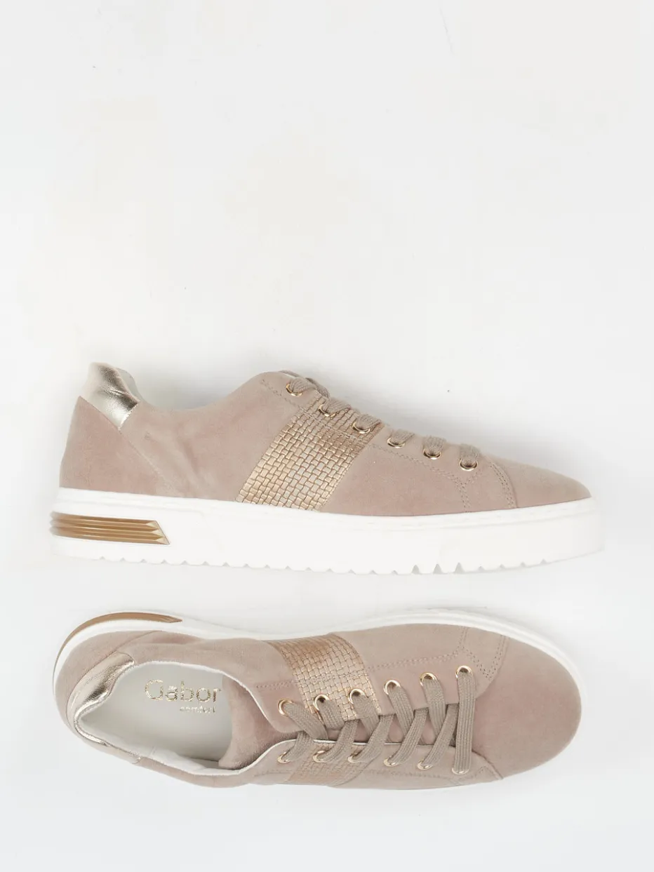 Feiner Komfort für moderne Freizeitlooks.Gabor Comfort zeigt diesen Damen-Sneaker aus der Linie „Davos“ in beigem Veloursleder mit roséfarbenem Unterton. Perfekt für entspannte Tage, kombiniert der Schuh softes Veloursleder mit gewebten Metallic-Details und einem glänzenden Fersenelement in Gold. Der klassische Schnitt mit Schnürung und komfortabler Weite H sorgt für ein angenehmes Tragegefühl. Die weiße, profilierte Gummisohle rundet das Modell alltagstauglich ab. Rosébeige und Gold liegen im Trend und lassen sich vielseitig zu Pastelltönen oder neutralen Casual-Looks kombinieren. Gabor Comfort steht für stilsicheres Design mit Wohlfühlvorteil.