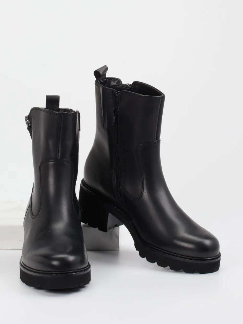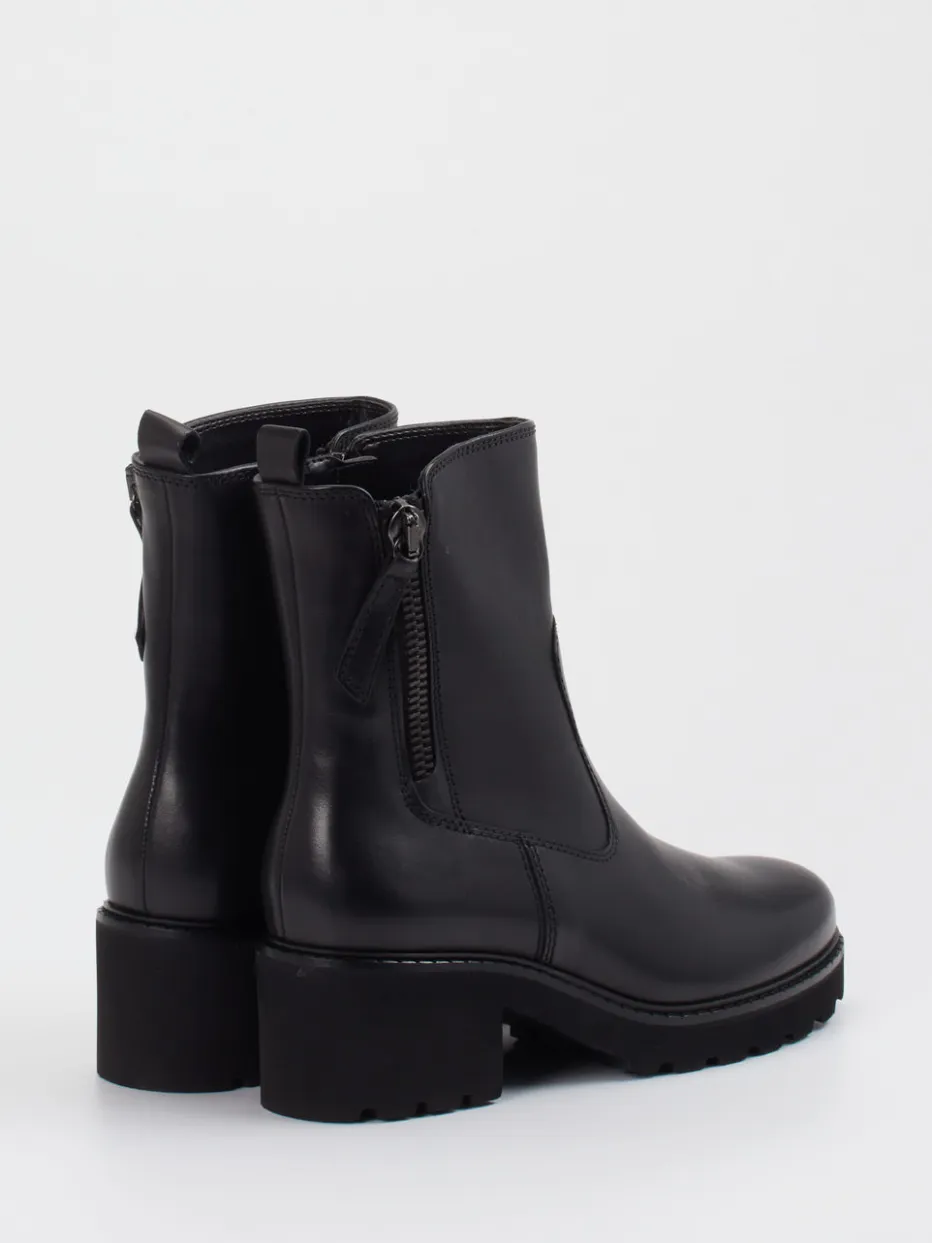 Urbaner Begleiter mit klarer Linie.Gabor Comfort präsentiert mit dieser Damen-Stiefelette ein Modell für die stilvolle Herbst-/Wintersaison. In Alltag und Office sorgt die schwarze Stiefelette aus mattiertem Kalbleder für souveräne Auftritte. Ihre klassische, knöchelhohe Form wird durch einen seitlichen Reißverschluss mit Lederzipper funktional ergänzt. Ton-in-Ton-Nähte und eine rückseitige Zuglasche betonen das reduzierte Design. Die markant profilierte Sohle mit 4 cm Blockabsatz liefert Tragekomfort und festen Stand – passend zum „Quiet Utility“-Trend. Minimalistische Mode lässt sich damit ebenso kombinieren wie klassische Wollmäntel. Ein vielseitiger Komfortschuh – gefertigt für urbanes, stilbewusstes Gehen.