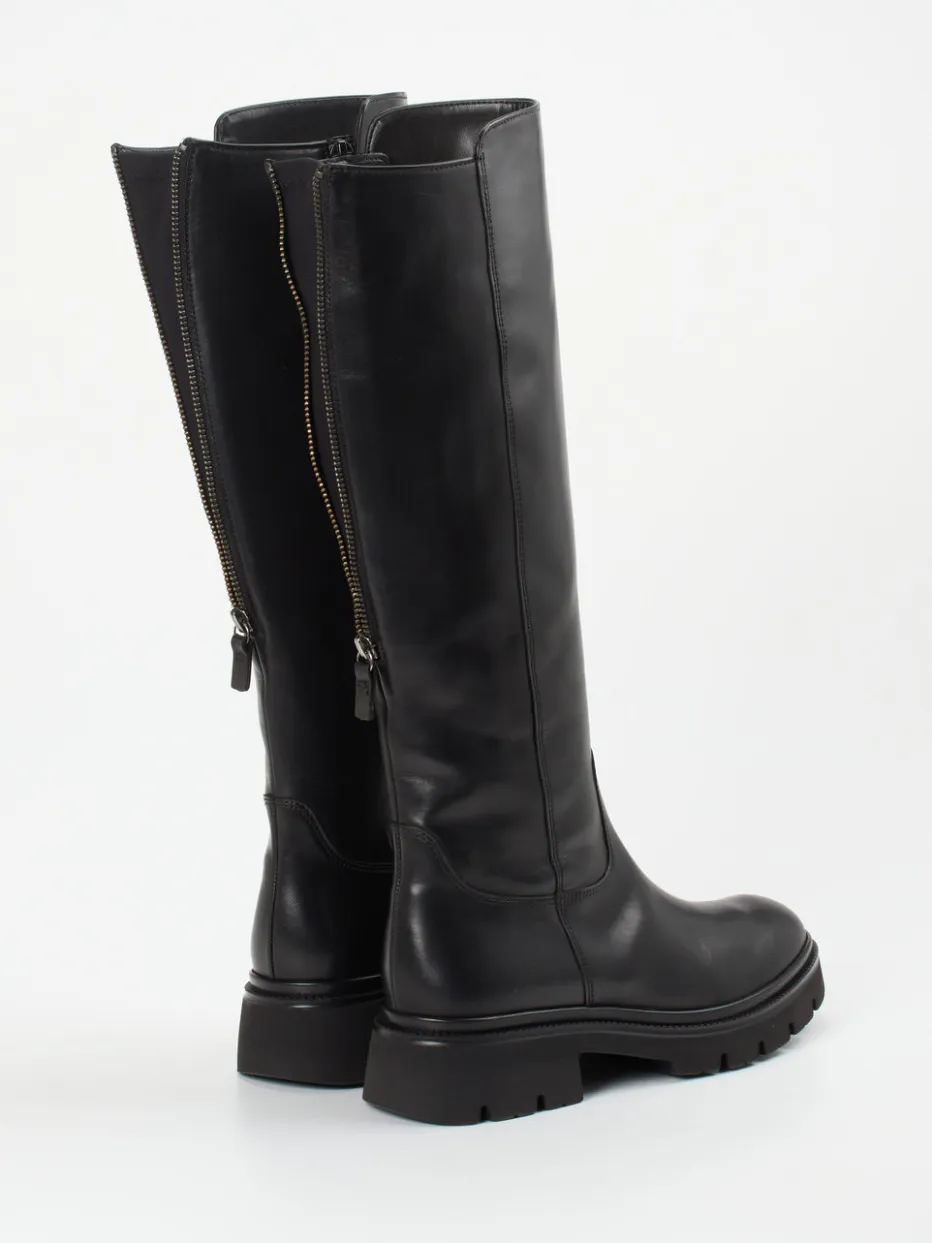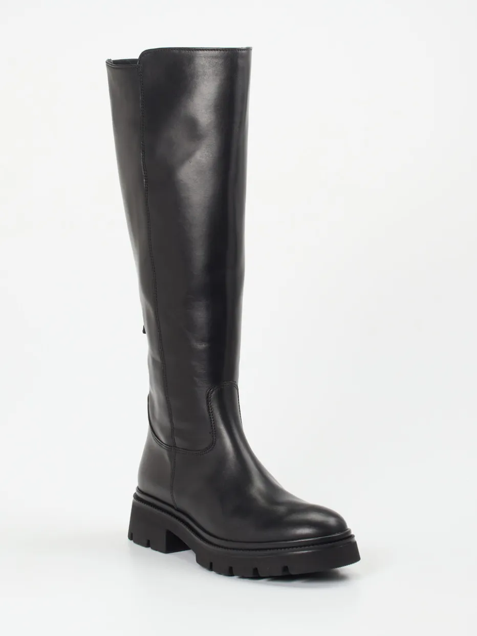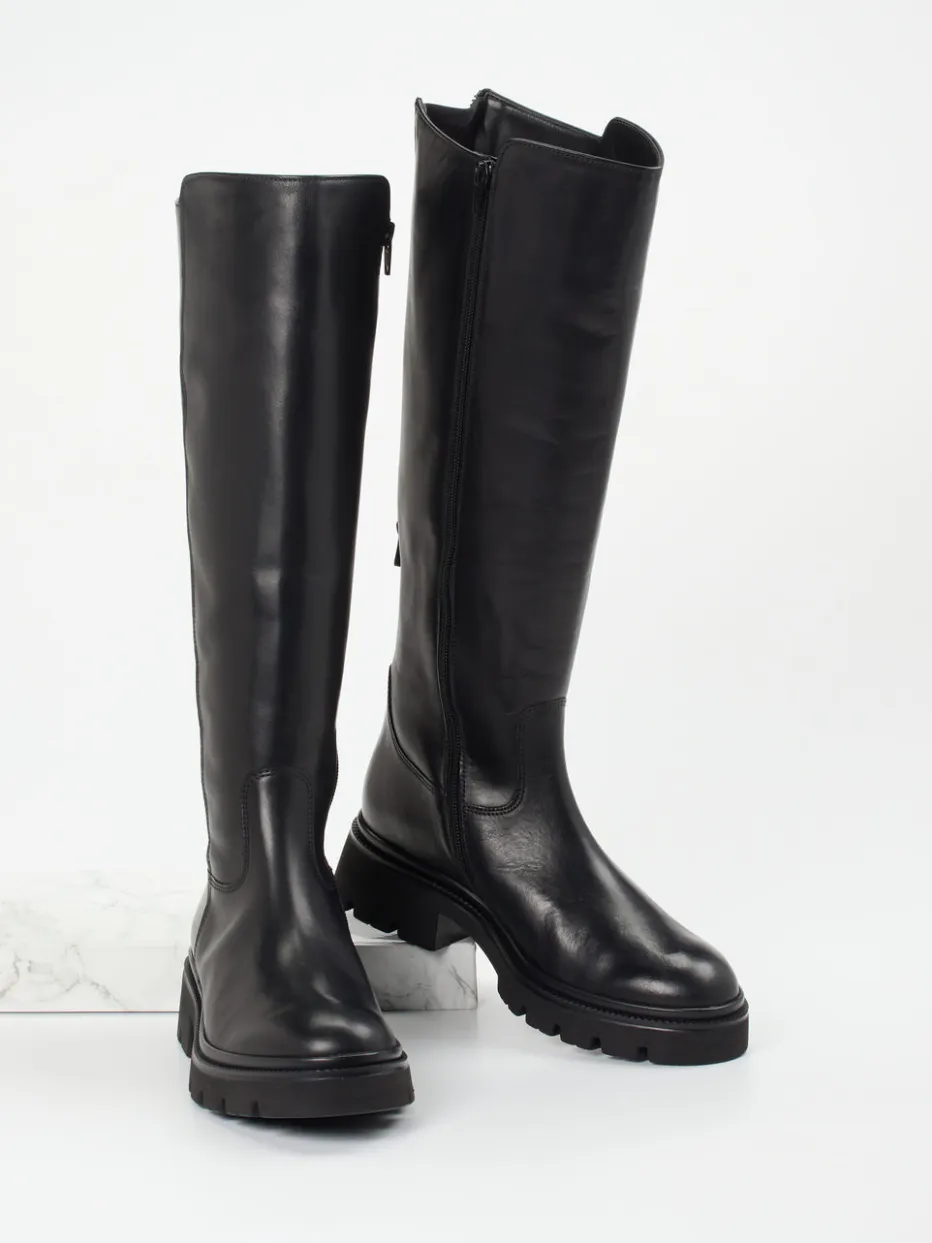 Dieser kniehohe Damenstiefel von Gabor kombiniert hochwertiges schwarzes Glattleder mit einer modernen Chunky-Sohle – ein minimalistisches Design mit funktionalem Reißverschluss am Schaft.