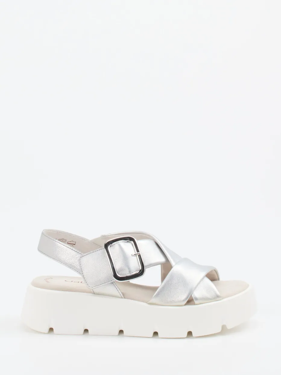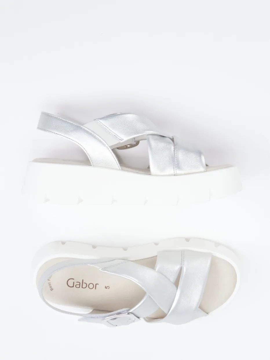 Glanzvolles Sommer-Statement.Gabor präsentiert mit dieser Plateau-Sandale ein elegantes Freizeitmodell für Damen. Die glänzende Oberfläche aus silberfarbenem Metallicleder zieht alle Blicke auf sich – ein echtes Trend-Piece für warme Tage. Breite, gekreuzte Riemen mit großer Metallschnalle und ein offenes Design geben der Sandale eine markante Silhouette. Das gepolsterte „Best Fitting“-Fußbett bietet gemeinsam mit der griffigen, weißen Gummisohle höchsten Tragekomfort. Metallic-Töne und Plateauformen sind Highlights der Saison – perfekt kombinierbar mit fließenden Sommerkleidern oder urbanen Streetwear-Looks. Ein Gabor-Modell, das Designanspruch und Alltagstauglichkeit überzeugend vereint.
