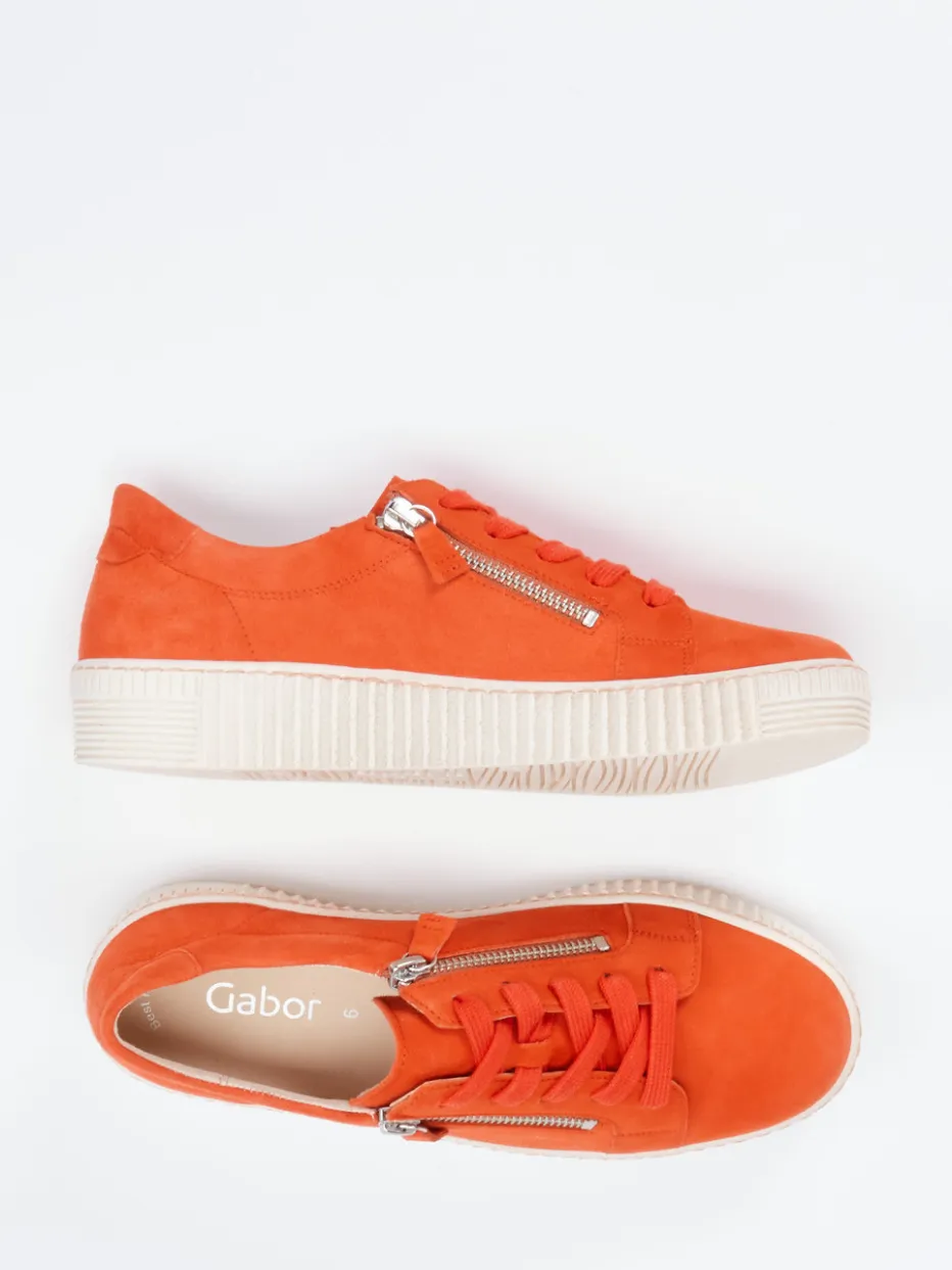 Gabor interpretiert den klassischen Damen-Sneaker neu – mit orangerotem Veloursleder, derbe Plateausohle und sportiver Ausstattung.