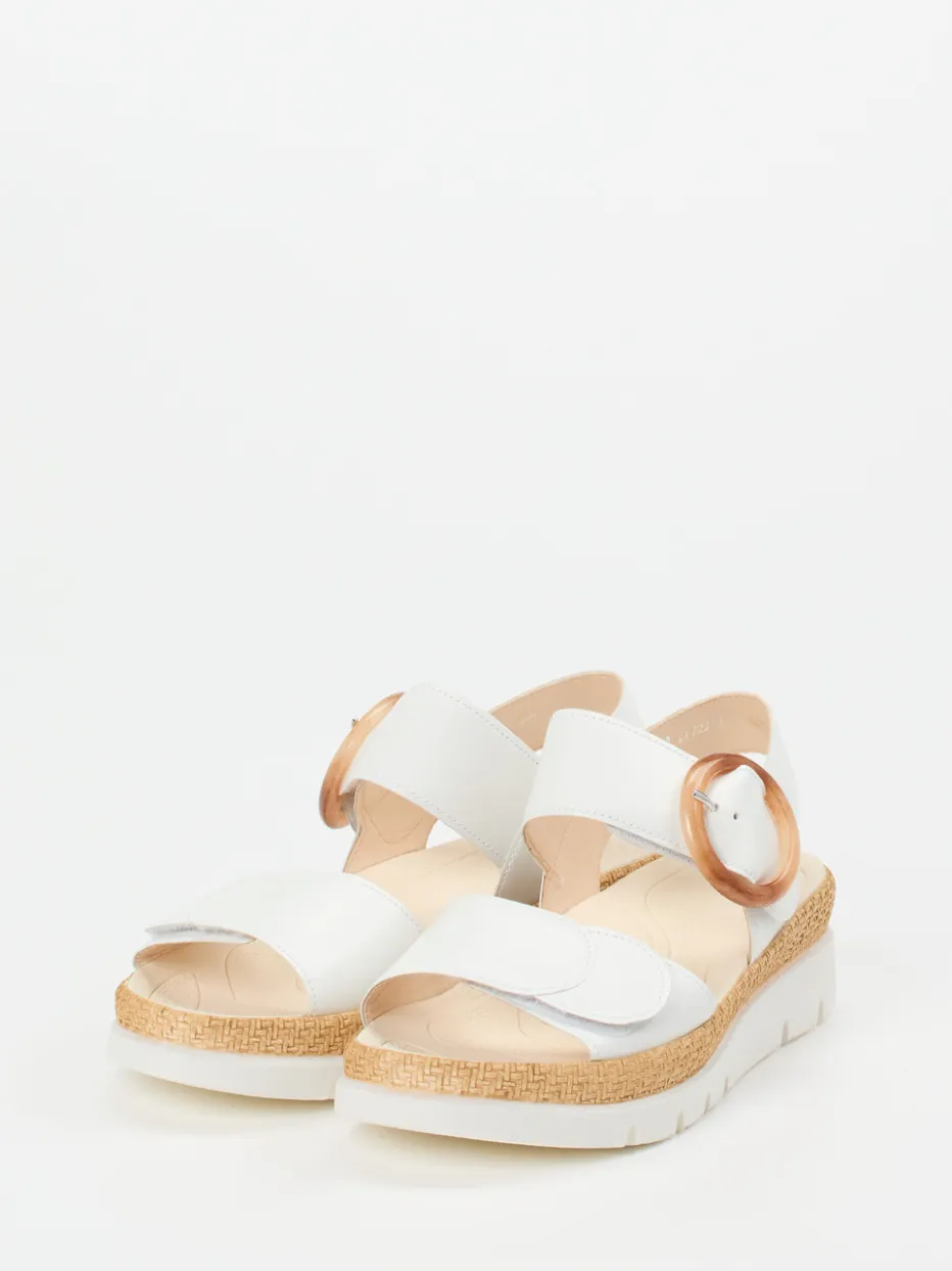 Sommerkomfort mit Stilanspruch.Die Gabor-Plateausandale für Damen überzeugt mit luftiger Offensilhouette und hochwertigen Details. Ein ergonomisch geformtes Komfort-Fußbett und flexible Gummisohle sorgen für entspanntes Gehen im Alltag und auf Reisen. Das fein glänzende Kalbleder in Weiß wirkt in Kombination mit der großen Hornoptik-Schnalle zugleich edel und modern. Die Baststruktur entlang der Zwischensohle unterstreicht die Trendthemen „Natural Textures“ und „Chunky Sandals“ der aktuellen Saison. Dank Klettverschlüssen lässt sich die Weite stufenlos regulieren – ideal für warme Tage. Gabor vereint Komfort, Handwerk und modisches Gespür für entspannte Sommertage.