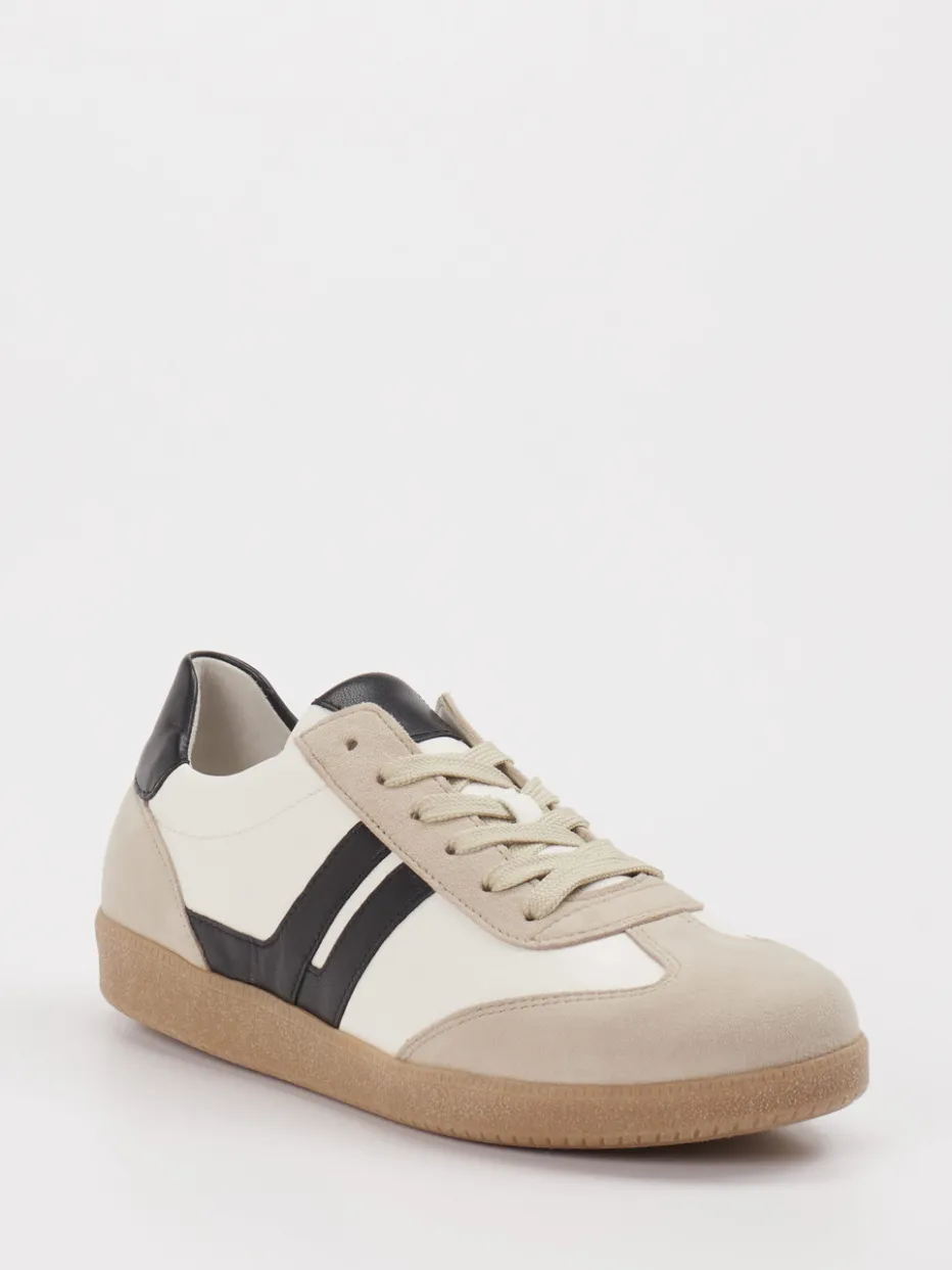 Streetstyle mit Vintage-Flair. Gabor präsentiert einen Damen-Sneaker, der durch seinen stilvollen Retro-Charme überzeugt. Ideal für entspannte Alltagssituationen, kombiniert dieser Schuh weiches Velours- und Glattleder mit einem schlichten Offwhite-Grundton und beigegrauen sowie schwarzen Kontrasteinsätzen. Die klassische Silhouette und die seitlichen Zierstreifen unterstreichen den sportlich-leganter Charakter. Eine gepolsterte Ferse sorgt für angenehmen Komfort, während die profilierte Gummisohle sicheren Halt bietet. Im Trend liegt das Modell durch seine 90er-Jahre-Anleihen und den „Quiet Luxury“-Look. Perfekt zu beigefarbenen Jogpants oder lässigen City-Outfits. Ein modisches Statement mit solider Alltagstauglichkeit – typisch Gabor.