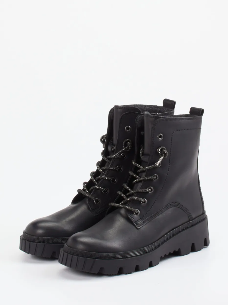 Diese robusten Lederboots vereinen komfortable Alltagstauglichkeit mit modischem Glanz. Minimalistische Gestaltung trifft auf glänzende Details und hohe Funktionalität.