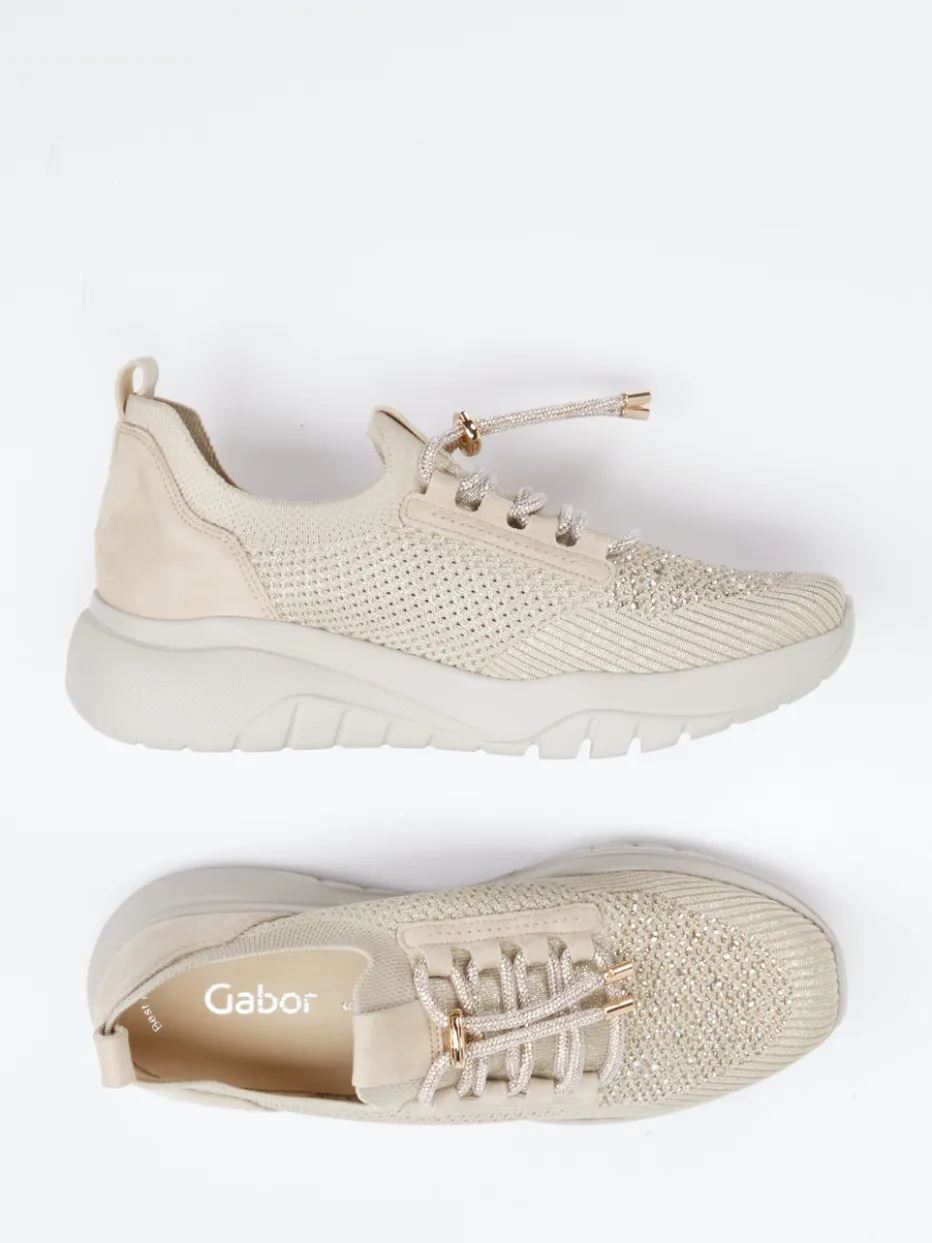 Ob für einen Spaziergang durch die Stadt oder einen stilvollen Homewear-Moment – das elastische Textilstrickmaterial passt sich dem Fuß optimal an. Kombiniert mit samtigem Veloursleder in Hellbeige, verleihen glitzernde Schmuckdetails und goldene Endkappen dem Sneaker eine dezente Eleganz. Die sportlich abgerundete Silhouette mit Schnellschnürung und flexibler Gummisohle bietet alltagstauglichen Komfort. Der Look harmoniert ideal mit Soft-Neutral-Trends der Saison und passt perfekt zu monochromen Outfits.