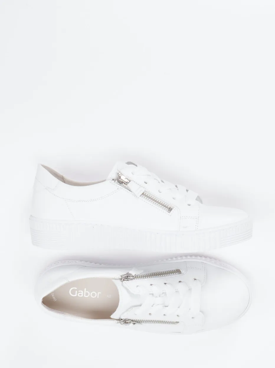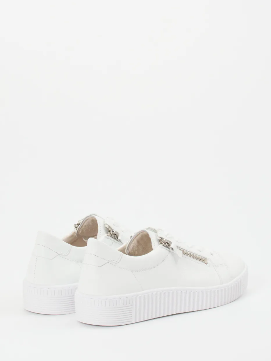 In sportlichem Design überzeugt dieser Sneaker der Marke Gabor durch seine komfortable Beschaffenheit. Das samtweiche, strukturierte Elchleder in Weiß wird durch tonige Steppnähte strukturiert. Sind die breiten Schnürbänder einmal justiert, erweisen sich die seitlichen, silberfarbenen Reißverschlüsse als angenehm. Von innen mit softem Leder gefüttert und mit einem Wechselfußbett ausgestattet ist Komfort garantiert. Die Sportlichkeit unterstreicht die tonige, strukturierte Gummisohle.