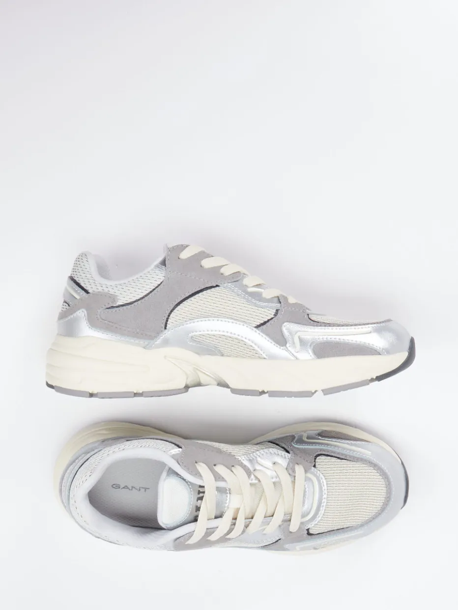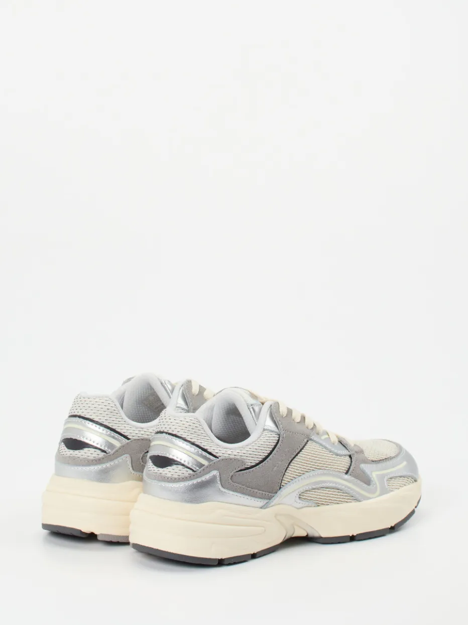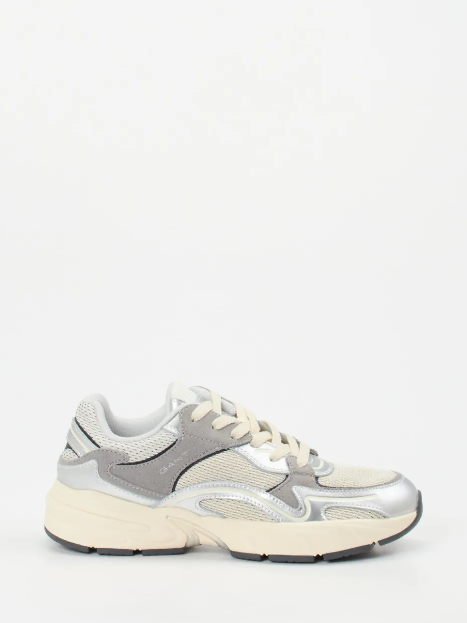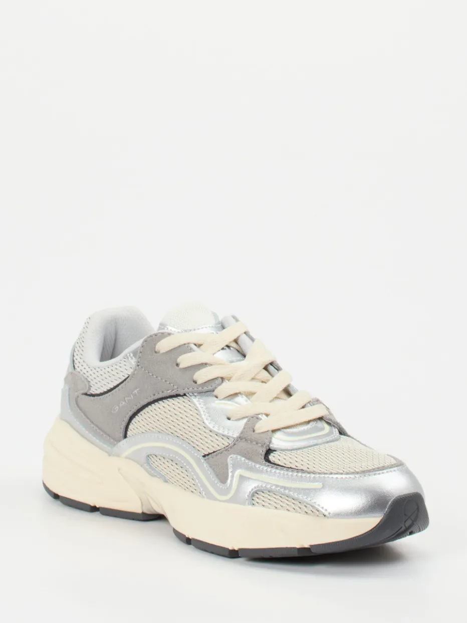Trendsicher im Metallic-Mix.Der Sneaker von Gant bringt sportiven Retro-Look in Einklang mit modernen Streetwear-Einflüssen. Ideal für urbane Looks mit modischer Kante vereint dieses Modell silberfarbenes Metallicleder, graues Veloursleder und helles Mesh mit strukturierter Oberfläche. Die voluminöse Silhouette unterstreicht den Chunky-Charakter, während die ergonomisch geformte Gummisohle mit ca. 3,5 cm Absatzhöhe angenehmen Tragekomfort bietet. Tonale Schnürung, reflektierende Details und metallische Highlights setzen wirkungsvolle Akzente. Ein Highlight im Frühjahrs-/Sommer-Styling – am besten kombiniert mit Athleisure-Pieces oder monochromen Freizeitoutfits. Mit markentypischer Souveränität zwischen Designanspruch und Alltagstauglichkeit.