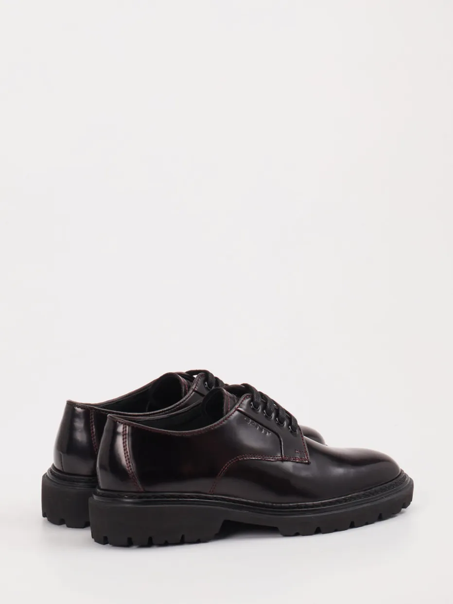 Die glänzende Hochglanzleder-Oberfläche in Dunkel-Bordeaux verleiht dem Modell eine edle Ausstrahlung, während die tief profilierte Gummisohle für sicheren Halt im urbanen Umfeld sorgt. Schwarze Akzente wie Ösen und Innenfutter aus Kalbleder unterstreichen den minimalistischen Look, der durch die klassische, runde Form vollendet wird. Der dezente Logo-Prägung und die fein abgestimmten Ton-in-Ton-Nähte fügen sich harmonisch in das Gesamtbild. Dieses Modell passt ebenso gut zu gepflegten Business-Looks wie zu stilvollen Freizeitoutfits.