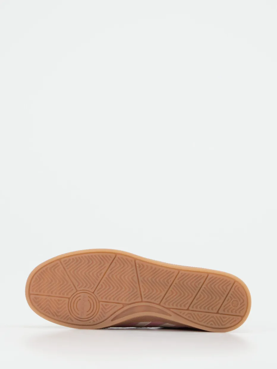Vintage-Akzent für urbane Styles.Gant präsentiert einen Retro-Sneaker, der modernes Design mit 90er-Flair kombiniert. Raffinierte Freizeitlooks profitieren von der Kombination aus samtig strukturiertem Veloursleder und geripptem Cordstoff in zartem Rosa. Die flache Silhouette trifft auf bordeauxrote Akzente an der Ferse sowie braune Velours-Overlays – unterstrichen durch tonale Nähte und eine Logo-Prägung seitlich. Mit kontrastierendem Weiß an Schnürung und Streifen sowie einer honigfarbenen Gummisohle entsteht ein sportlich-entspannter Eindruck. Ideal zur Mom-Jeans oder Canvas-Tote-Bag für ein trendbewusstes Streetwear-Outfit. Komfort und Designkompetenz von Gant vereint in einem Sneaker mit Retro-Charme.