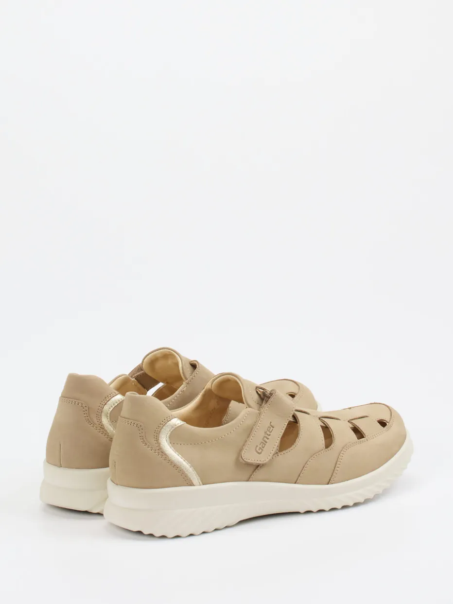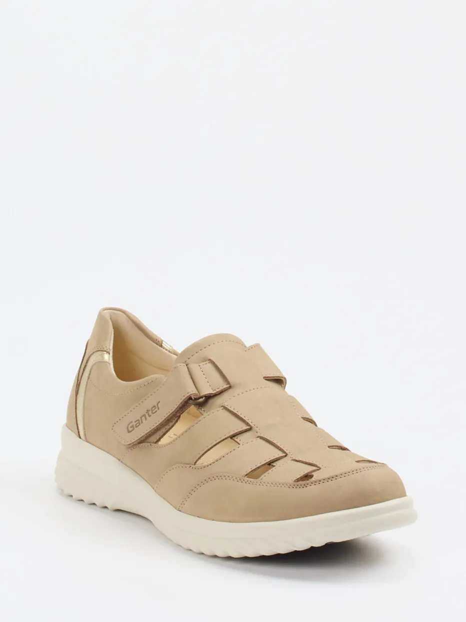 Leichtigkeit für den Alltag.Die Marke Ganter präsentiert eine komfortable Sandale mit geschlossener Form aus der Kategorie Bequemschuhe. Ideal für entspannte Sommertage bietet das Modell aus hochwertigem Nubukleder – samtig angeschliffen und in sanftem Beigeton – ein besonders angenehmes Tragegefühl. Luftige Cut-Outs verbessern die Atmungsaktivität, während der praktische Klettverschluss eine individuelle Anpassung erlaubt. Die ergonomische, profilierte Laufsohle und das austauschbare Leder-Kork-Fußbett sorgen für dauerhaft ermüdungsfreies Gehen. Goldfarbene Akzente an der Ferse setzen einen stilvollen Akzent und fügen sich perfekt in den „Quiet Luxury“-Trend ein. Ein bequemer Favorit mit dezentem Chic – typisch Ganter.