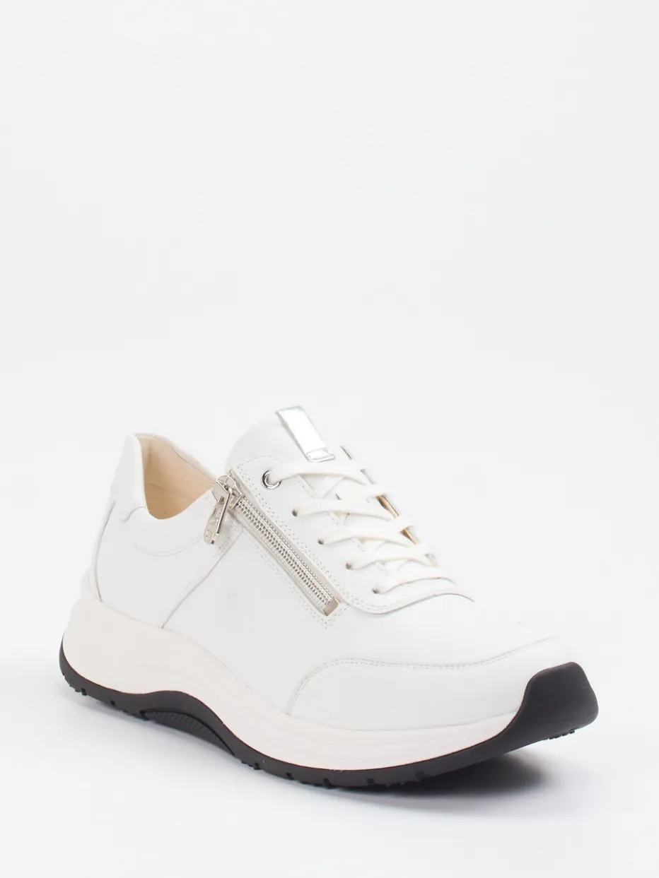 Für längere Wege in der Stadt oder entspannte Freizeitstunden bietet dieser Sneaker aus butterweichem Kalbleder mit matter Oberfläche wohltuenden Tragekomfort. Das dominierende Off-White harmoniert mit dezenten, silbernen Reißverschlussdetails und Ton-in-Ton-Nähten. Klassisch-sportlich in der Silhouette, erleichtert die Kombination aus Schnürung und seitlichem Zipper das An- und Ausziehen. Die dämpfende Gummisohle mit 4-Punkt-Technologie fördert einen natürlichen Abrollvorgang. Perfekt für „Quiet Luxury“-Looks mit Stretch-Jeans und Lederaccessoires.