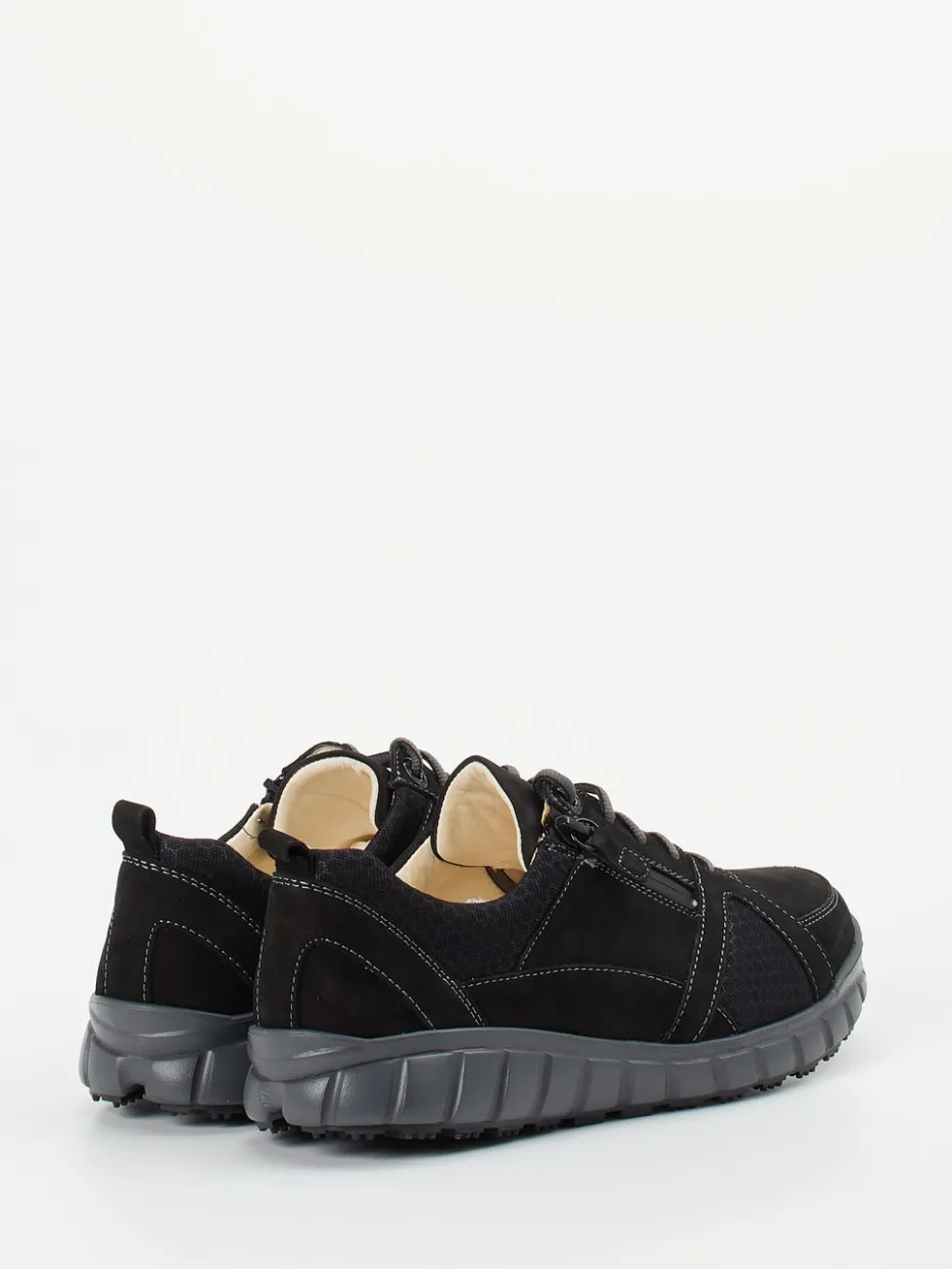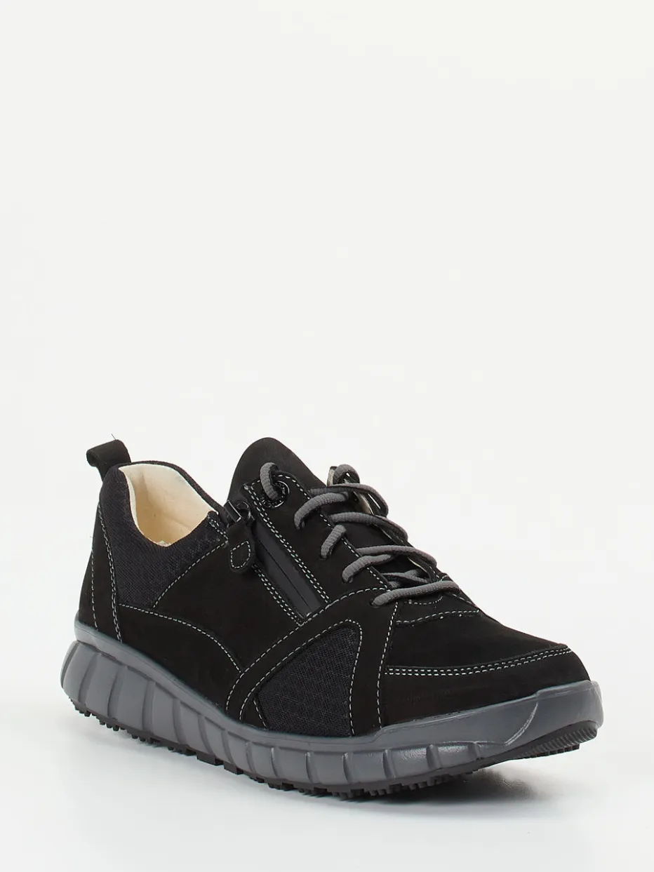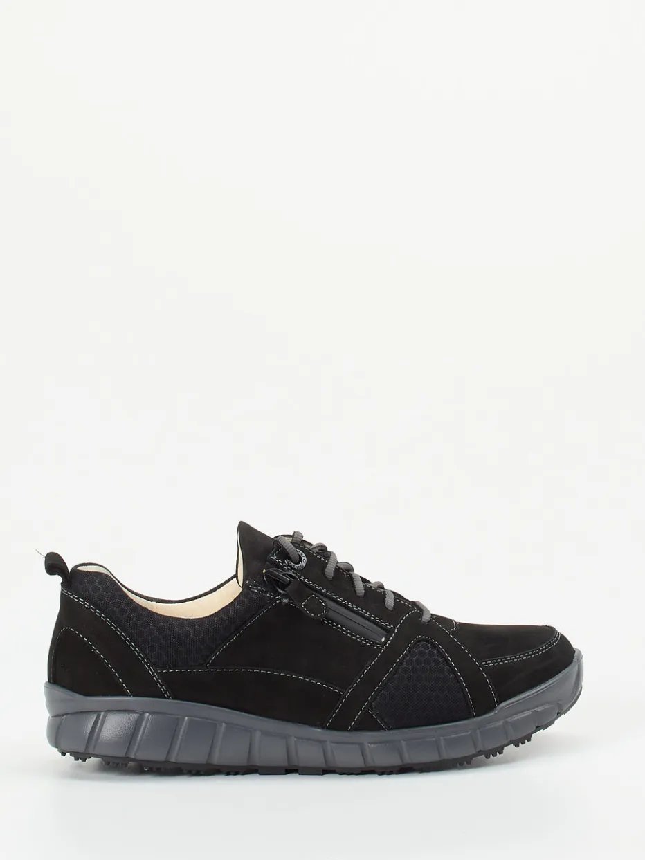 Vielseitig unterwegs mit Leichtlauf-Komfort.Ganter präsentiert einen schwarzen Komfort-Sneaker mit durchdachtem Design für Alltag und Freizeit. Der Schnürschuh kombiniert hochwertiges Veloursleder mit atmungsaktivem Mesh-Textil in matter Oberfläche. Das rund ergonomische Design überzeugt mit seitlichem Reißverschluss, hellgrauen Kontrastnähten und einer praktischen Zuglasche. Innen weich gepolstert und mit austauschbarem lederbezogenem Korkfußbett ausgestattet, sorgt er für Gehkomfort selbst auf langen Strecken. Die profilierte Gummisohle bietet Trittsicherheit auf verschiedenem Untergrund, urbane Streetwear-Anleihen treffen auf Outdoor-Tauglichkeit. Ein funktionaler Sneaker mit Ganter-Leichtlauf-Technologie für anspruchsvolle Komfortansprüche.