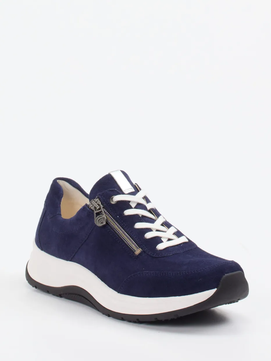 Minimalismus trifft Tragkomfort.Ganter präsentiert einen Damen-Komfort-Sneaker aus hochwertigem Veloursleder. Für entspannte Alltagseinsätze zeigt sich das dunkelblaue Modell als wohltuend leicht und bequem. Das samtig angeschliffene Veloursleder verleiht ihm eine matte, ruhige Ästhetik. Weiß abgesetzte Schnürung und ein seitlicher Reißverschluss erleichtern das Anziehen und setzen klare Akzente. Die Gummisohle mit ergonomischem 4-Punkt-System federt gelenkschonend ab, während das austauschbare Latexfußbett zusätzlich Komfort verspricht. Dank Weite H, gepolstertem Schaft und Lederfutter eignet sich dieser Sneaker besonders für komfortorientierte Looks im Freizeitbereich. Ein durchdachter Alltagsbegleiter – mit Ganter-typischer Funktionalität und puristischem Stil.