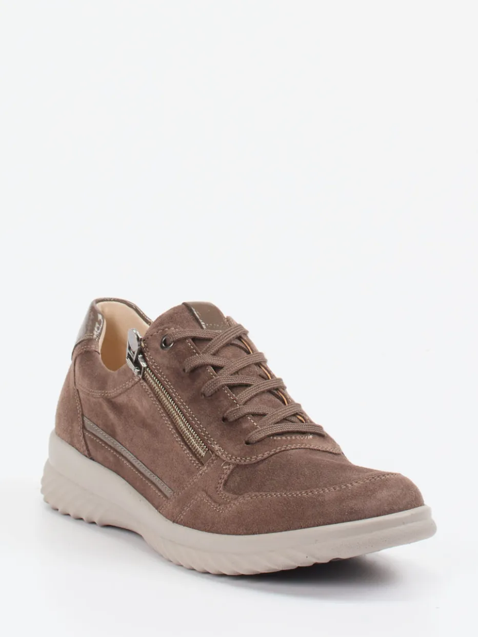 Dezente Begleiterin für bequeme Stunden.Ganter präsentiert mit diesem Komfort-Sneaker ein Modell für Damen, das lässigen Stil mit durchdachtem Komfort verbindet. Ob beim Stadtbummel oder in der Freizeit zu Hause – das Modell aus hochwertigem Veloursleder, samtig matt angeschliffen, überzeugt mit seiner mittelbraunen Farbgebung und dezenten Lackdetails an Ferse und Lasche. Die klassische, gerundete Silhouette wird durch Schnürung und seitlichen Reißverschluss ergänzt, wodurch ein müheloses An- und Ausziehen möglich ist. Die stoßdämpfende Laufsohle und die Eignung für Einlagen machen ihn besonders tragefreundlich. Stilistisch passt er perfekt zu minimalistischen Looks in sanften Neutralfarben. Markentypischer Komfort für stilbewusste Alltagssituationen.