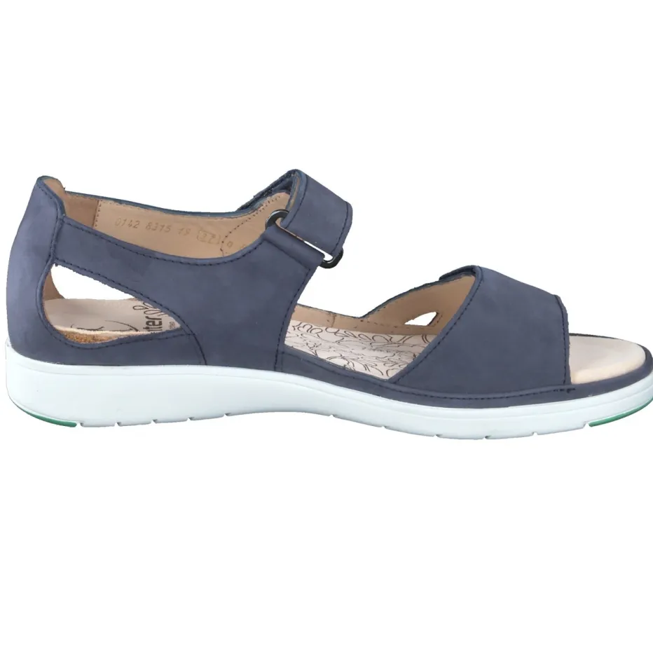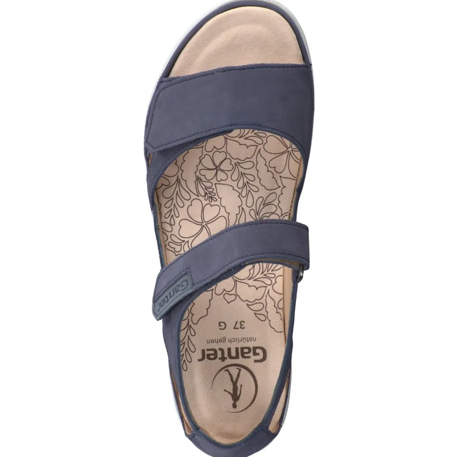 Bequemer Stil für warme Tage.Die Marke Ganter überzeugt in der Komfortkategorie mit dieser Damen-Sandale in Dunkelblau. Für ausgiebige Stadtbummel oder entspannte Momente zu Hause bietet sie mit ergonomisch geformtem Fußbett und gepolsterter Innensohle ein gehobenes Tragegefühl. Gefertigt aus samtig angeschliffenem Nubukleder, ergänzt durch ein atmungsaktives Innenfutter aus vegetabil gegerbtem Leder. Zwei Klettverschlüsse optimieren die Passform, während die weiße Gummisohle mit grünem Profil sicheren Halt gewährleistet. Designakzente wie das florale Muster im Fußbett und die Ton-in-Ton-Nähte unterstreichen den funktional-minimalistischen Look. Lässt sich ideal mit Leinenhosen oder Funktionsshirts kombinieren. Ein Modell für stilbewusste Frauen mit Wunsch nach natürlichem Komfort.