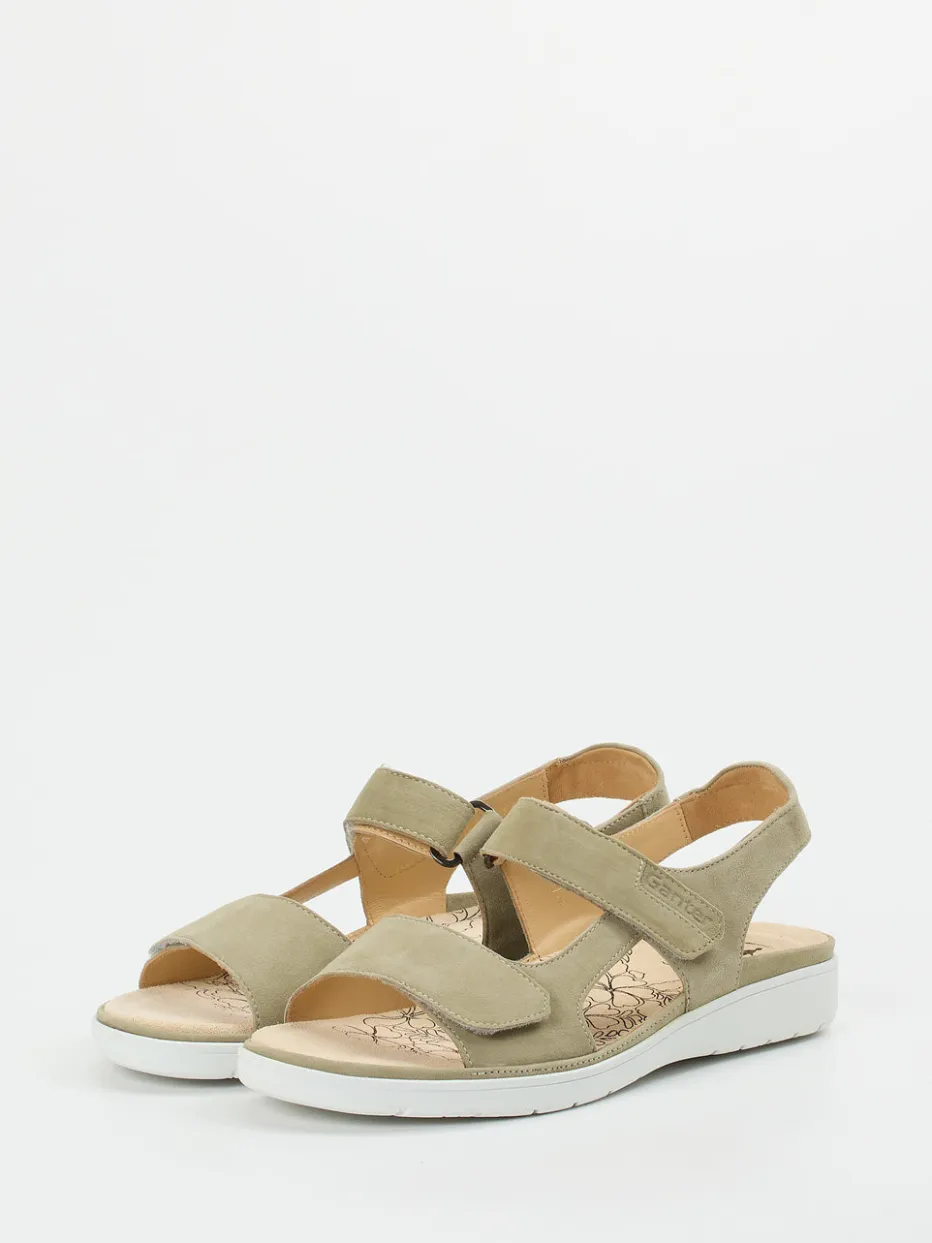 Ideal für entspannte Sommertage.Ganter präsentiert mit dieser Komfortsandale ein alltagstaugliches Damenmodell für warme Jahreszeiten. Salbeifarbenes Veloursleder mit mattierter Oberfläche und tonalen Nähten verleiht der offenen, ergonomisch geformten Silhouette ein zurückhaltend-edles Erscheinungsbild. Zwei Klettverschlüsse sorgen für individuell anpassbaren Halt, während das gepolsterte, wechselbare Fußbett mit floralem Print angenehmen Tragekomfort bietet. Die flexible weiße Gummisohle ist rutschhemmend und unterstreicht den funktionalen Charakter des Designs. Inspiriert von Soft Neutrals und Functional Footwear, eignet sich dieses Modell besonders für entspannte Freizeitmomente oder ein natürliches Home-Styling. Komfort auf Ganter-Niveau – durchdacht bis ins Detail.