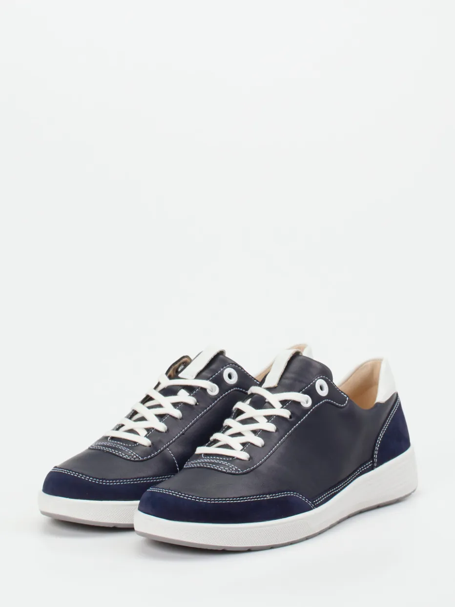 Zurückhaltendes Design trifft Tragekomfort.Ganter bietet mit diesem Herren-Sneaker ein Modell, das Alltagstauglichkeit und Stil souverän verbindet. Ideal für entspannte Aktivitäten überzeugt der dunkelblaue Sneaker durch die Kombination aus glattem und samtig angeschliffenem Kalbleder. Weiße Schnürung, Kontrastnähte und ein gepolsterter Fersenbereich sorgen für visuelle Dynamik und angenehmen Halt. Die ergonomische Gummisohle mit dämpfender 4-Punkt-Konstruktion ergänzt das klassische Low-Top-Design. Streetwear-Einflüsse und minimalistische Details unterstreichen den zeitlosen Look. In Kombination mit Stretch-Jeans entstehen gepflegte Casual-Outfits. Markentypisch komfortabel dank passgenauem Schnitt und weich gepolstertem Innenleben.