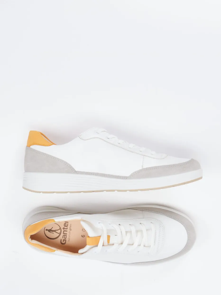 Schlichtes Design trifft Komfortanspruch.Ganter präsentiert mit diesem Low-Top-Sneaker ein Modell für Damen in der Form Gerda. Ideal für entspannte Alltagsmomente verbindet der Sneaker weißes Kalbleder mit strukturierten Veloursleder-Overlays in Graunuancen und Cameltönen. Der klassische Schnitt mit rundem Leisten wird durch die gepolsterte Ferse und die ergonomische Profilsohle funktional ergänzt. Die Schnürung erlaubt die individuelle Weiteneinstellung, während das austauschbare Fußbett orthopädischen Ansprüchen gerecht wird. Soft Color Blocking verleiht dem Stil eine moderne Note. Mit subtiler Ästhetik und gesundem Komfort steht Ganter für gehobene Alltagstauglichkeit.