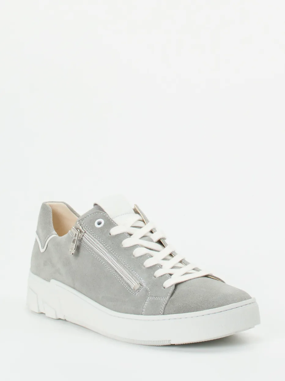 Die Kombination aus hellgrauem Veloursleder – samtig angeschliffen – und pragmatischen Details wie der gepolsterten Schaftrand-Partie, der komfortablen Weite G und einem silberfarbenen Reißverschluss ergibt einen stimmigen Look. Die verstärkte, rutschhemmende Gummisohle sorgt gemeinsam mit dem weichen Kork-Fußbett für angenehmes Gehen, auch über längere Distanzen hinweg. Der cleane Schnitt und weiße Akzente transportieren dezente Streetwear-Ästhetik im Geiste von „Quiet Luxury“. Lässt sich mit Basic-Shirts und Crossbody-Bag lässig kombinieren.