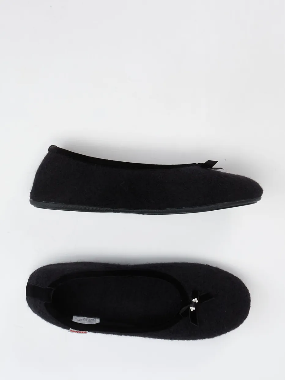 Komfort trifft auf leises Stilbewusstsein.Giesswein präsentiert einen femininen Hausschuh im klassischen Ballerina-Stil für Damen. Ideal für ruhige Momente zu Hause, kombiniert dieses Modell wärmenden Wollfilz mit einer samtig-filzigen Oberfläche in tiefem Schwarz. Der rund geformte Einstieg ist mit einem edlen Veloursband eingefasst, während eine zarte Zierschleife mit Strassdekor dem Design eine elegante Note verleiht. Die rutschfeste Gummisohle garantiert sicheren Halt auf glatten Böden. Als ruhiger Begleiter zu Loungewear unterstreicht dieser Hausschuh den „Quiet Luxury“-Trend der Saison. Ein stilbewusster Wohlfühlschuh mit funktionalem Anspruch – typisch Giesswein.