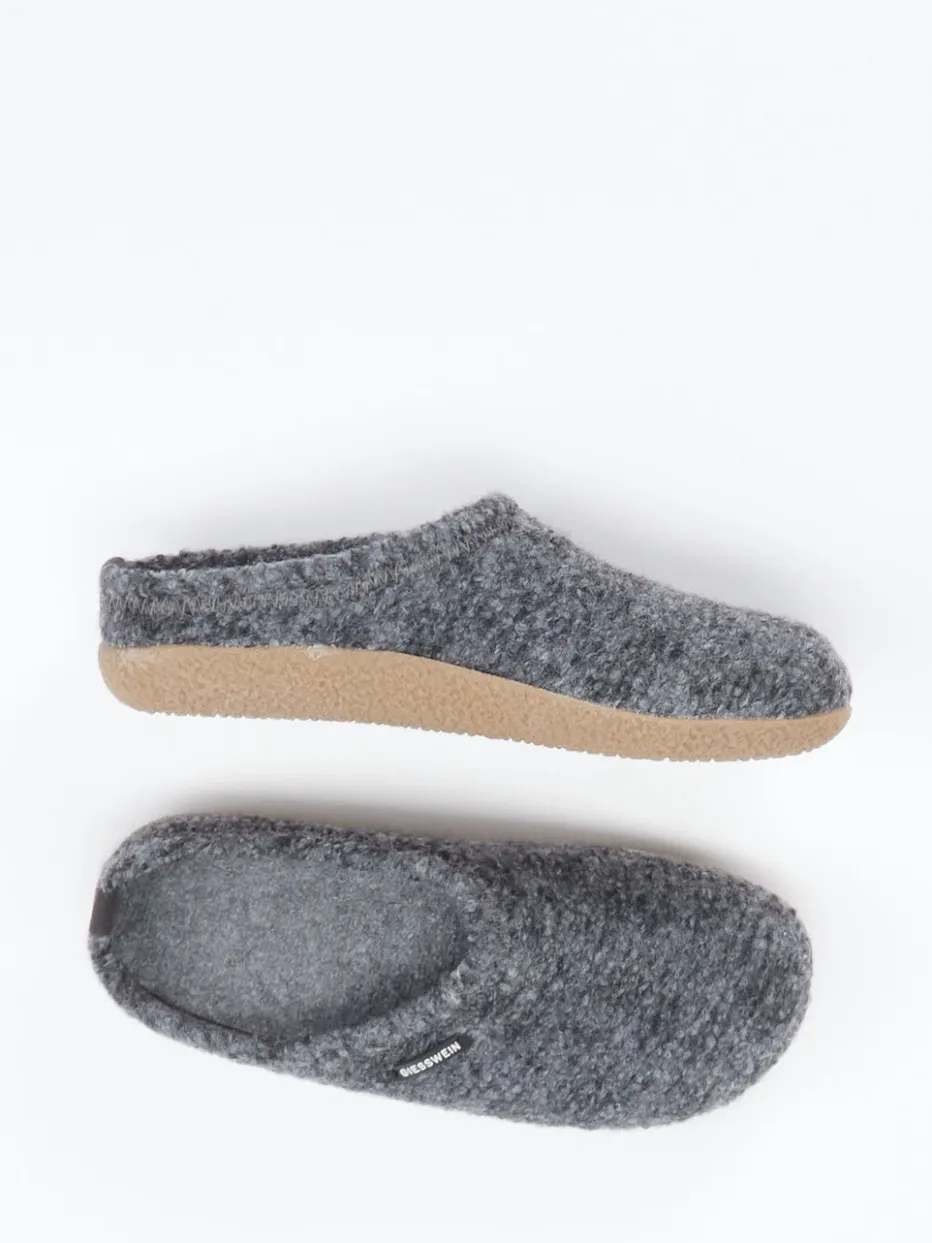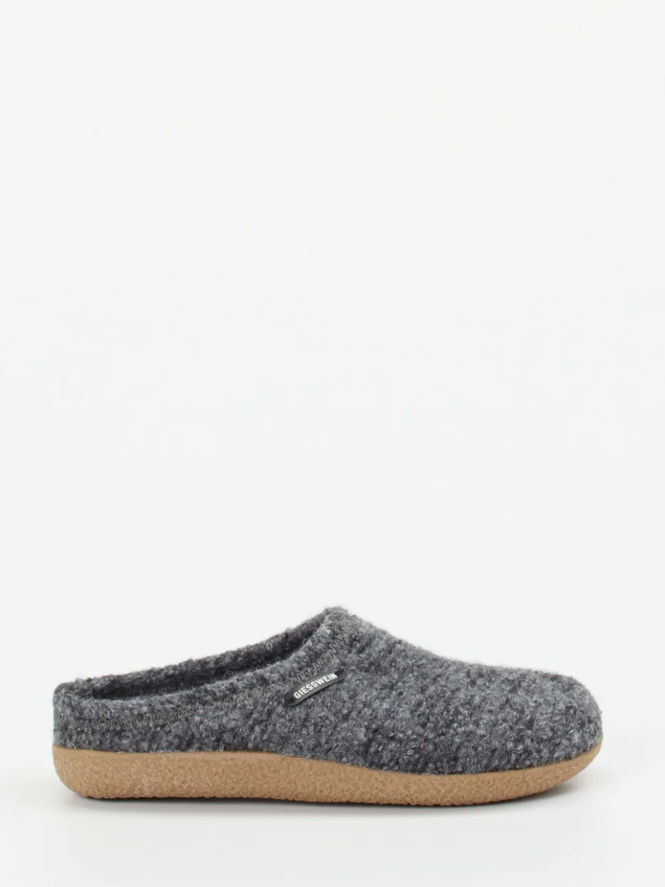 Entspannung trifft Funktionalität.Giesswein präsentiert einen hochwertigen Hausschuh in anthrazitgrauem Wollfilz. Die melierte Oberfläche der temperaturausgleichenden Schurwolle verleiht dem Modell in offener Clog-Form einen dezenten Naturlook. Das ergonomisch geformte Fußbett ist bequem und herausnehmbar. Eine strukturierte honigfarbene Gummisohle sorgt für rutschfesten Gang auf glatten Böden. Der Slip-On-Stil ohne Verschluss unterstreicht den lässigen Loungewear-Charakter. Ton-in-Ton-Nähte und ein seitliches Markenlabel setzen dezente Akzente. Ein langlebiges Basic für gemütliche Stunden mit klarer Designsprache von Giesswein.